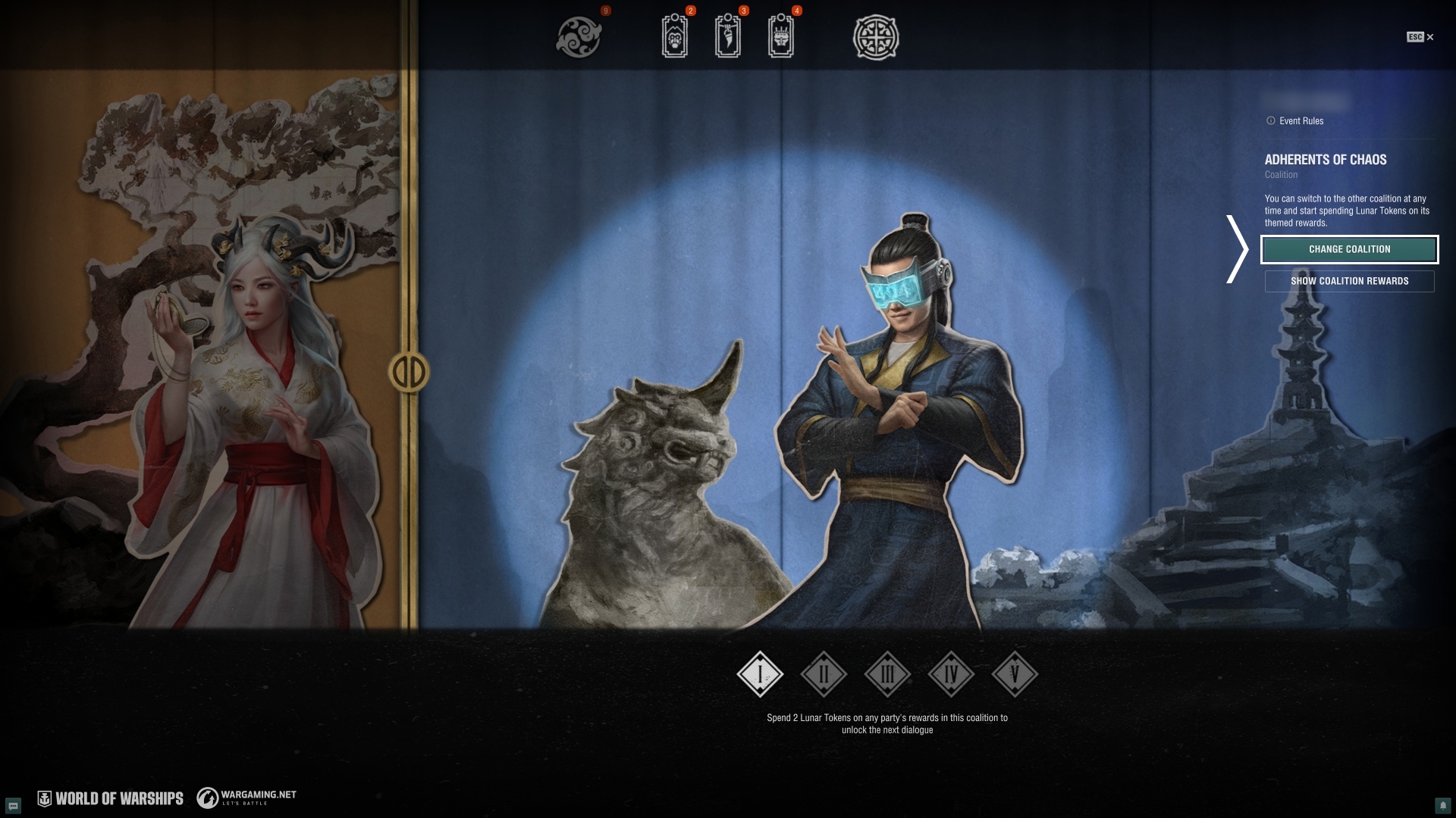 Vous retrouverez l'évènement en cliquant sur une bannière dans le port. Il y a deux coalitions — Défenseurs de l'Ordre et Adeptes du Chaos — qui disposent toutes deux de plusieurs lignes de progression avec des récompenses distinctes à la clé.