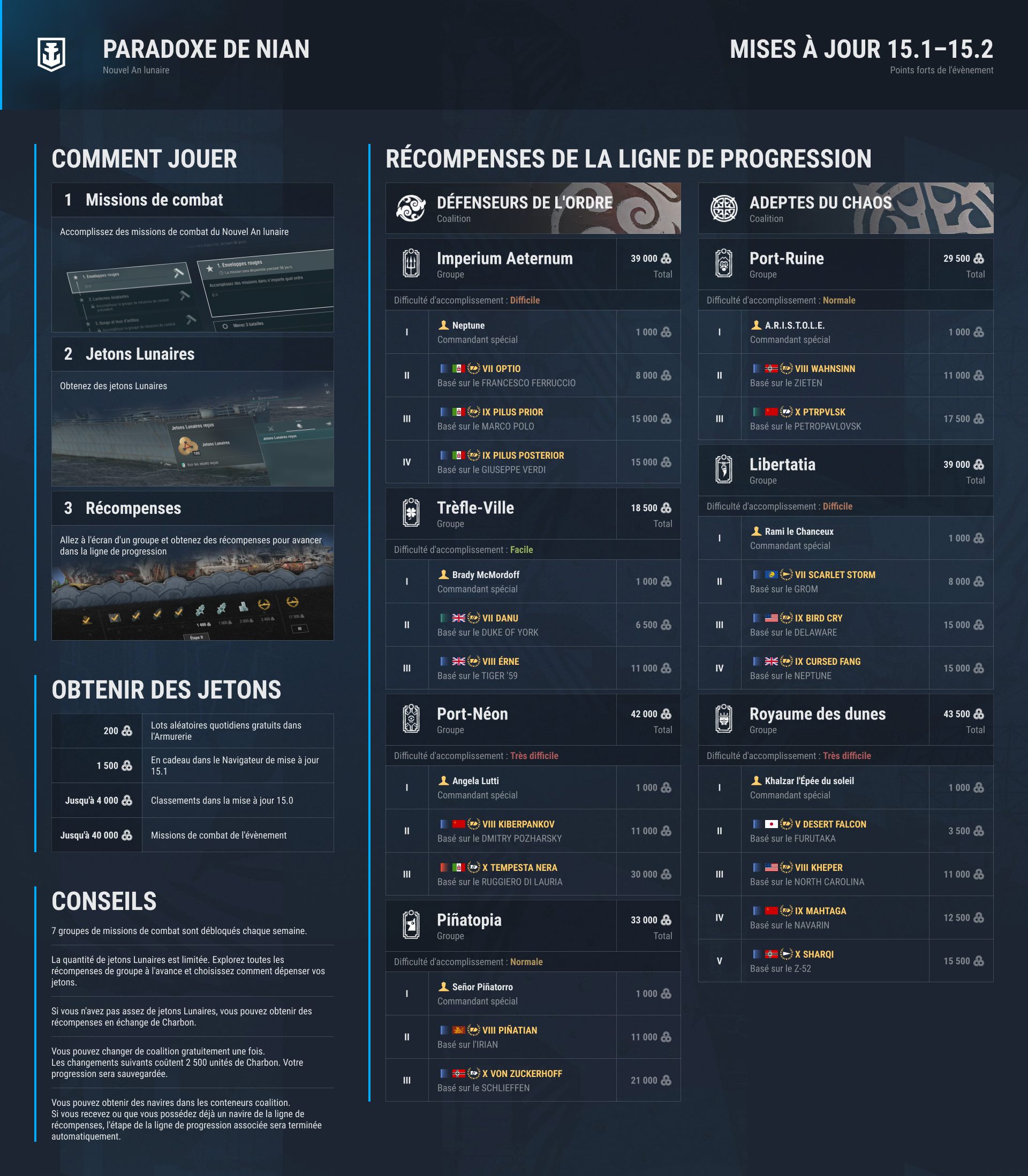 La mise à jour 15.1 a commencé !La dernière mise à jour du jeu vous plonge dans la culture et la mythologie d'Asie de l'Est à l'occasion du Nouvel An lunaire. Participez aux festivités et aux évènements que nous avons préparés pour vous, et n'hésitez pas à découvrir le nouveau type de bataille Front indestructible et à profiter de ses mécaniques de réapparition. Vous pouvez découvrir tout cela et plus dans notre article dédié à la mise à jour 15.1 :Voir la Liste des changementsParadoxe de Nian : Choisissez votre camp !Choisissez un camp, menez des batailles et débloquez des navires premium et spéciaux gratuitement tout en suivant notre histoire axée sur la bête redoutable Nian et les forces qui s'affrontent pour la contrôler.Vous retrouverez l'évènement en cliquant sur une bannière dans le port. Il y a deux coalitions — Défenseurs de l'Ordre et Adeptes du Chaos — qui disposent toutes deux de plusieurs lignes de progression avec des récompenses distinctes à la clé.Chaque ligne permet d'obtenir un commandant avec un doublage individuel en tant que récompense initiale. Selon sa difficulté, chaque ligne inclut également deux à quatre navires premium et spéciaux thématiques de rangs V à X basés sur des modèles existants.Pour progresser dans les lignes de groupe, vous aurez besoin de jetons Lunaires, que vous pouvez obtenir en accomplissant des missions de combat ou en ouvrant des lots aléatoires quotidiens gratuits. Vous en avez déjà obtenu si vous avez participé aux évènements Classement de la mise à jour 15.0 !Apprenez-en plus sur les règles et récompenses de l'évènement Paradoxe de Nian dans un article dédié :En savoir plusRéapparaissez dans Front indestructibleUn nouveau type de bataille temporaire est arrivé dans le jeu, et il dispose de mécaniques qui seront familières pour les joueurs qui ont participé au type de bataille Ligne indestructible l'année dernière.Voici ce qui a changé depuis : Vous pouvez désormais sélectionner un secteur de réapparition après avoir été coulé. Vous réapparaîtrez à l'intérieur des limites de la carte, ce qui permettra d'être redéployé plus rapidement. En plus des zones-clés, chaque carte dispose désormais de bases d'équipe capturables. Vous pouvez choisir un consommable de l'évènement avant chaque bataille dans le port et il y a deux consommables pour chaque type de navire. Répondez au sondage de la 15.1 !Vous appréciez les nouveautés introduites dans la mise à jour 15.1 ? Dites-nous ce que vous en pensez grâce au sondage disponible via le lien ci-dessous !Répondre au sondage