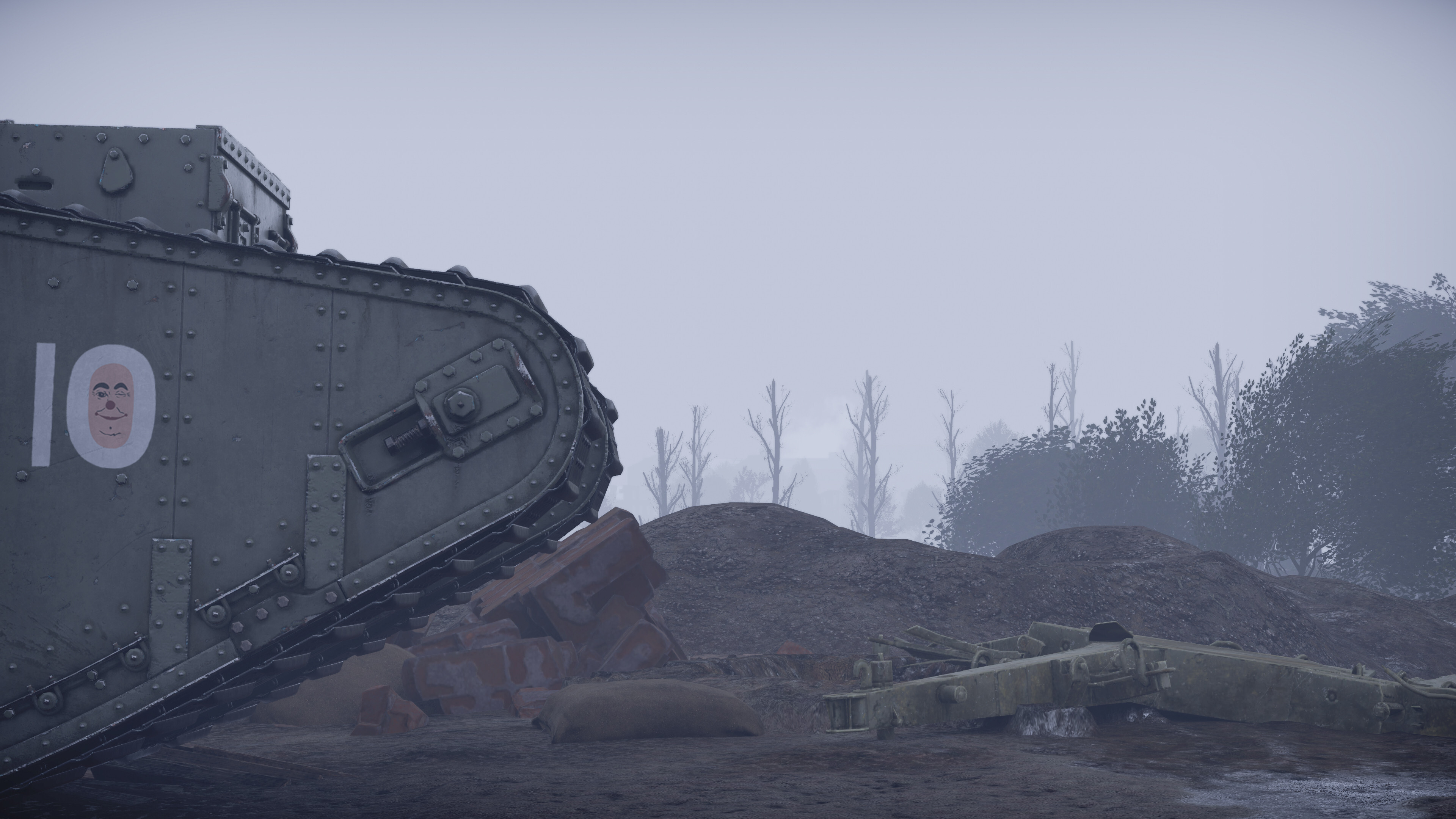 “Winking Clown” emblem, F Battalion, 16th Company, 2nd Section, British Tank Corps. This somewhat unsettling emblem belonged to a British Female tank, serial number 2716, commanded by 2nd Lieutenant Seymour. Not many details on the tank’s service and crew are known, with sources even conflicting on the first name of the tank’s commander. Records of the tank go cold after the Third Battle of Ypres on July 31st, 1917. It does not appear after this point or in any salvage logs, which strongly suggests it was lost in the battle. The marking itself is similarly mysterious, it may possibly be based on a French Pierrot clown, as the nickname of the tank "Feu D'enfer" (Hellfire) was also French. It was positioned on the hull of the tank on the starboard side under the driver's cabin, next to the battalion letter F which appeared before the 10.