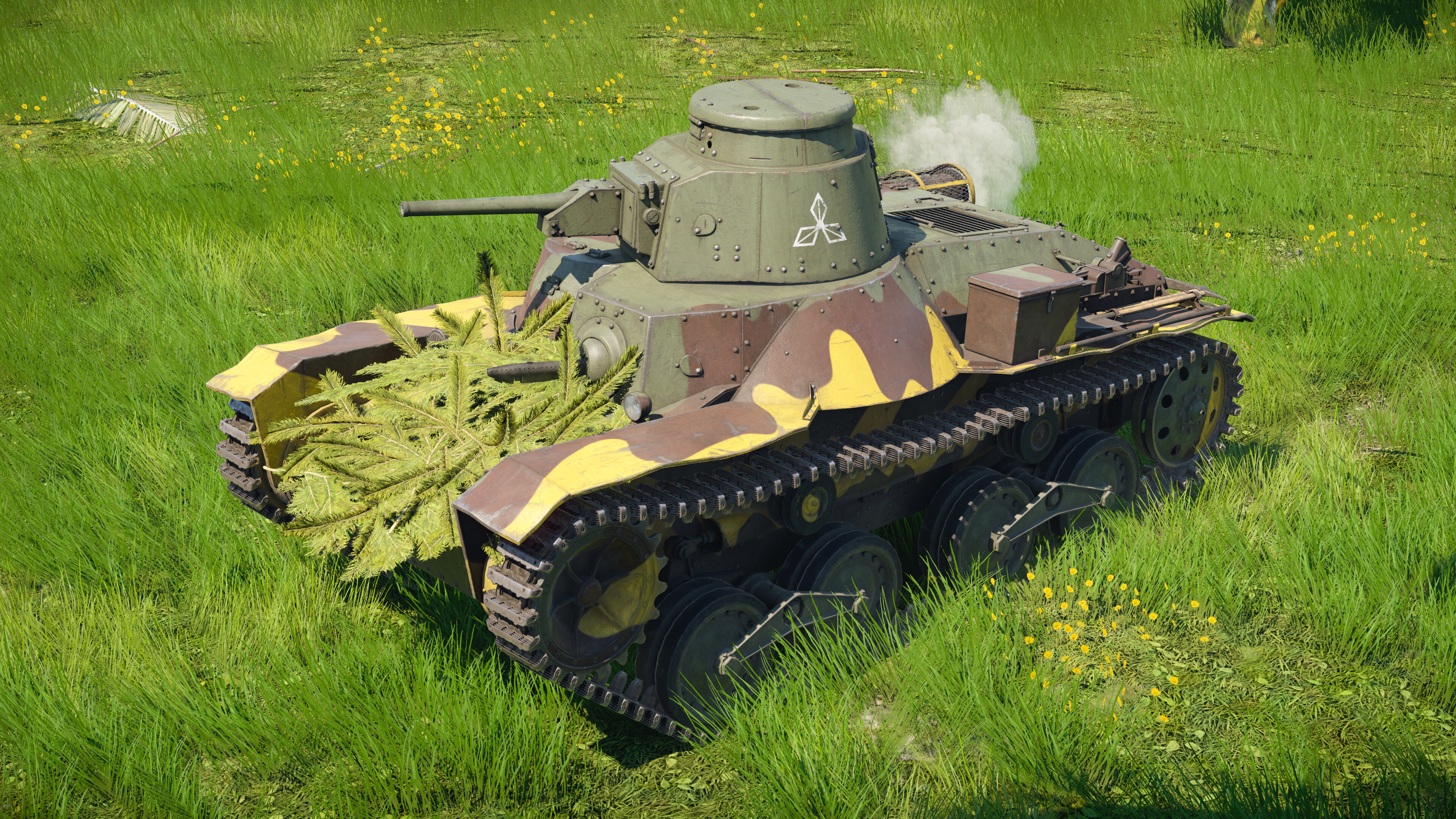 Emblem of the 14th Infantry Division, Imperial Japanese Army. The emblem of the division undeniably resembles the Mitsubishi logo, and while there are circumstantial links to this likeness being deliberate, there is limited conclusive evidence to draw on. The 14th operated Ha-Go tanks manufactured by Mitsubishi, and during the 1940s, their logo was depicted with a more rhomboid shape, matching the emblem of the 14th closely. It could also be a visual reference to the codename of the division, “照兵団” or “Shining Division,” with the emblem intending to emulate rays of light. These kinds of markings were often less standardized and informal in the later war years, and aside from their basic shape, deriving the meaning behind the design is regularly speculative. The emblem was placed on the turret sides of the Division’s Ha-Go tanks while deployed in Peleliu in 1944.