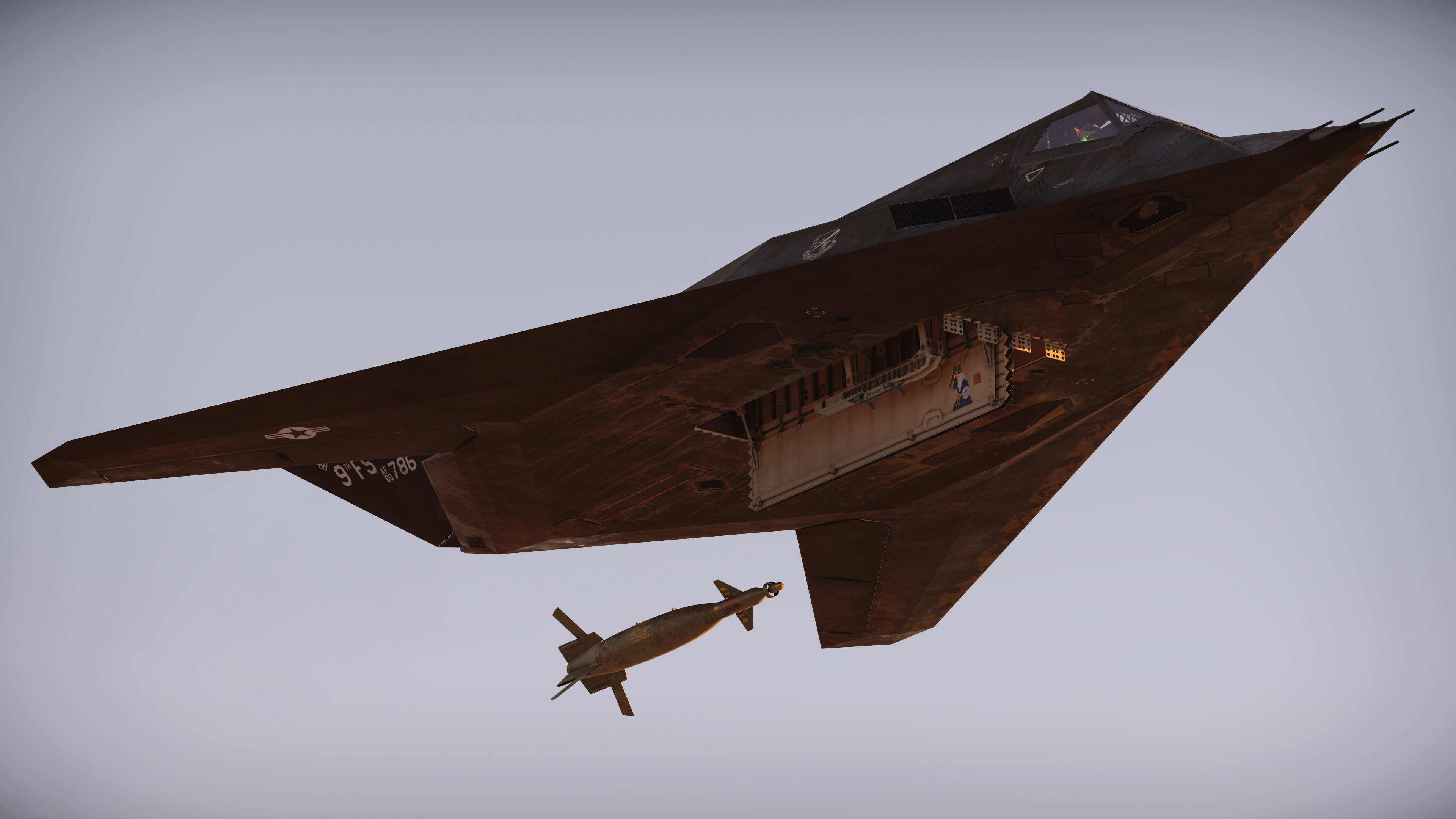 “GBU Wizard” artwork, 416th Tactical Fighter Squadron, USAF. Following the prominent Air Force tradition of personal nose art, F-117 pilots in the Gulf War had to not only be tactical with their aircraft, but with their markings as well. As the aircraft were painted with special RAM paint, personal markings were forbidden on the exterior of the aircraft as to not compromise the special radar-absorbing properties of the coating. Unperturbed by this restriction, pilots painted their personal markings on the inside of the aircraft on the internal bomb bay doors instead. Most of the artwork focused around the mystical nature of the F-117, with many examples of artwork pertaining to magic and sorcery. This quintessential example was painted at the edge of the internal bomb bay door on F-117 81-10797, with the accompanying text "Spell Bound" off to the right.