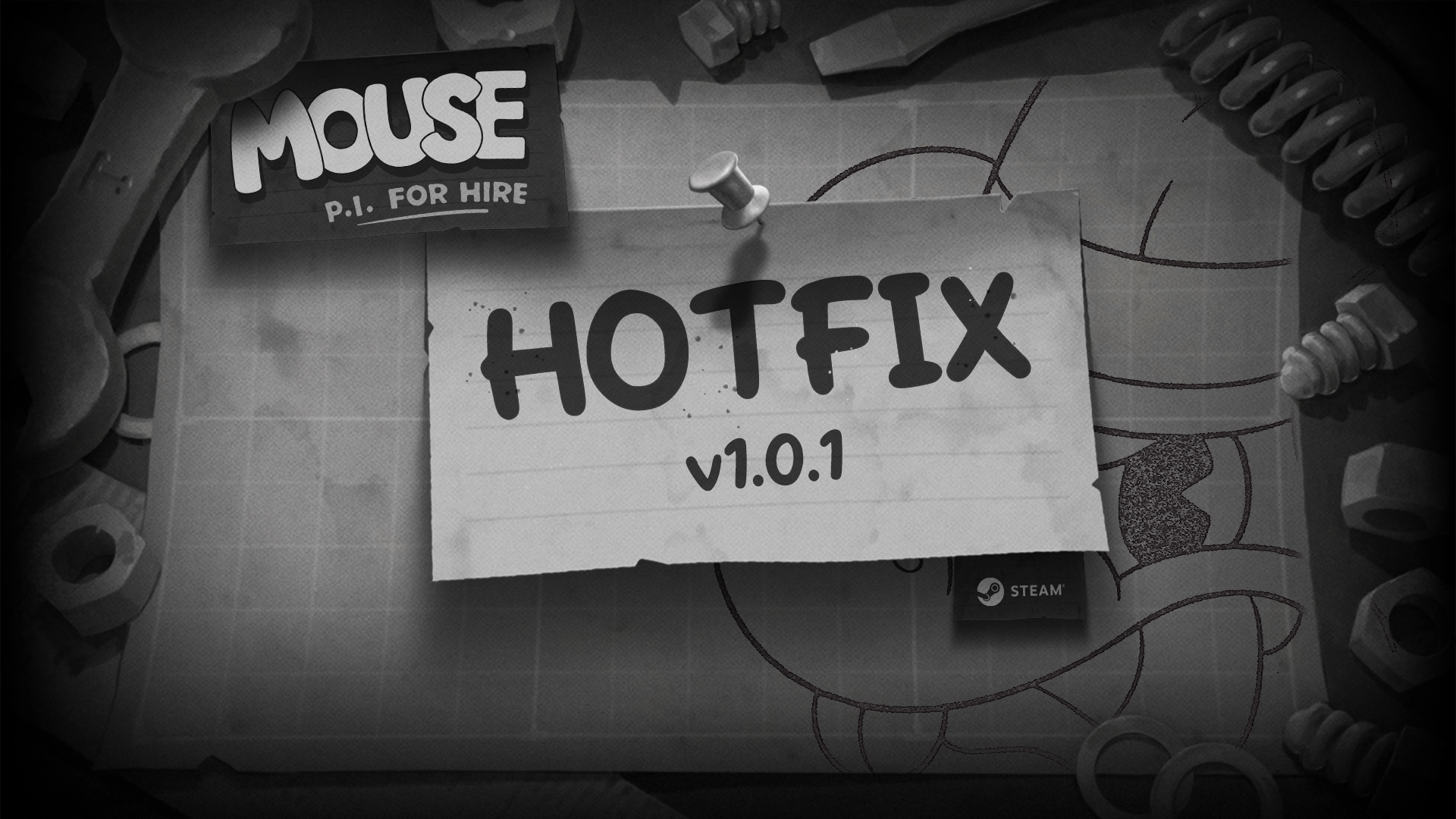 Detectives,Today we are releasing a Hotfix for MOUSE: P.I. For Hire on Steam to address a range of issues. Check out all the details below. Happy investigating!Hotfix v1.0.1Steam:Build ID: 22814717Fixes & ImprovementsResolved a graphical issue in “The Reel Deal” that could previously prevent players from progressing due to a black screen when lens distortion is disabled.Fixed a collision issue in the “Mouseburg Opera” mini-boss arena to prevent players from getting stuck on the environment.Corrected a logic error in “Far Wetlands” where the “No Entry Yet” door could fail to open after all enemies were defeated.Improved enemy pathfinding in “Quagmire” to stop units from snagging on doors and level geometry which could cause a progression blocker.Improved the final boss’s movement patterns during the “The Reel Deal” encounter.Ensured the D-namite throwing animation now triggers consistently.Refined a small number of Simplified Chinese translations for better accuracy.Addressed a bug where shotgun-wielding enemies would occasionally fail to deal damage to the player.Restored the “Exit to Main Menu” and “Exit Game” prompts in settings for players on ROG Ally, Xbox Platforms and other Handheld devices.