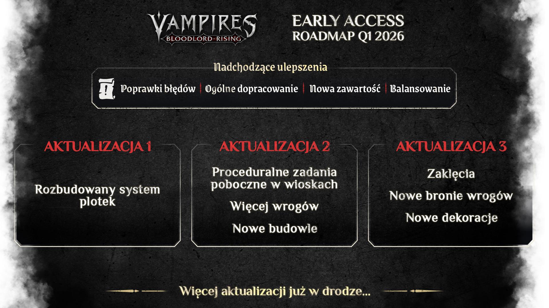 Teraz, gdy podróż się rozpoczęła, chcemy podzielić się tym, co przed nami.Nasza roadmapa opiera się na jednym głównym celu: rozwijaniu gry razem z Wami poprzez słuchanie i analizowanie Waszych opinii oraz sugestii. Ostatnie playtesty, a także Wasze wrażenia z pierwszego dnia, dały nam jasny obraz tego, jakie powinny być kolejne kroki. Czego jeszcze nie ma na roadmapieUważnie śledziliśmy wszystkie opinie, którymi dzieliliście się z nami na Steamie, Discordzie i w mediach społecznościowych. Wielu z Was liczy na ulepszenia walki, kreator postaci lub bardziej rozbudowany świat.Chcemy jasno powiedzieć, że rozumiemy, jak ważne są te tematy i absolutnie mamy je na uwadze. Jednocześnie są to duże elementy, których odpowiednie dopracowanie może zająć sporo czasu. Chcemy mieć pewność, że kiedy je wprowadzimy, będą spełniały jakość, na jaką zasługujecie.Podczas gdy wciąż badamy te rozwiązania i pracujemy nad nimi za kulisami, bardzo doceniamy Waszą cierpliwość. W międzyczasie będziemy informować Was na bieżąco, gdy tylko pojawią się nowe wieści. Mapa rozwojuPierwsza duża aktualizacja, którą planujemy wprowadzić, rozwinie funkcję, którą wielu z Was bardzo chwaliło i z której korzystało z przyjemnością: Plotki.Rozmawiając z mieszkańcami, możecie zbierać plotki, które pomagają zdecydować, których mieszkańców przemienić w wampirze sługi, dając wskazówki dotyczące bonusów, jakie mogą zyskać po przemianie. Chcemy pogłębić ten system, wprowadzając różne poziomy plotek oraz nadając negatywnym plotkom większy wpływ na rozgrywkę, aby zapewnić lepszy balans i bardziej znaczące wybory.W drugiej aktualizacji będziecie mogli zadbać o wieśniaków jako dobrodziej… lub tyran. Na podstawie wyboru otrzymacie odpowiednie zadanie we wsi. Wybierajcie mądrze, ponieważ podjęte decyzje wpłyną na Dobrobyt wioski.Budowanie to kolejny element, który wielu z Was uwielbia i który chcemy dalej rozwijać. Ta aktualizacja przyniesie nowe elementy do budowy, konstrukcje i materiały, dając Wam jeszcze więcej swobody twórczej. Dodatkowo w każdym regionie zacznie pojawiać się nowy typ wroga, wprowadzając świeże wyzwania podczas eksploracji. W trzeciej aktualizacji planujemy dodać nowy typ stacji roboczej. Stacja Wtajemniczonego pozwoli Wam ulepszać i zaklinać przedmioty. Inkwizycja zyska nowe moce broni w każdym regionie, co sprawi, że starcia bojowe będą bardziej zróżnicowane. Będziemy na bieżąco dzielić się informacjami i szczegółami na temat wszystkich nadchodzących aktualizacji.Prosimy, zostawiajcie swoje opinie i sugestie tutaj lub na naszym serwerze Discord. https://store.steampowered.com/app/2191500/Vampires_Bloodlord_Rising/