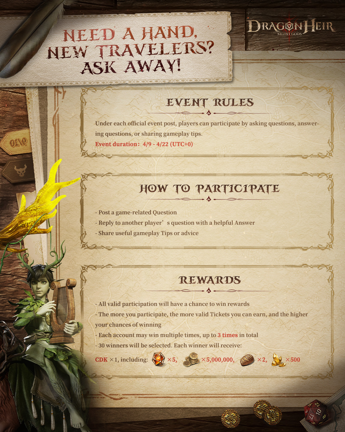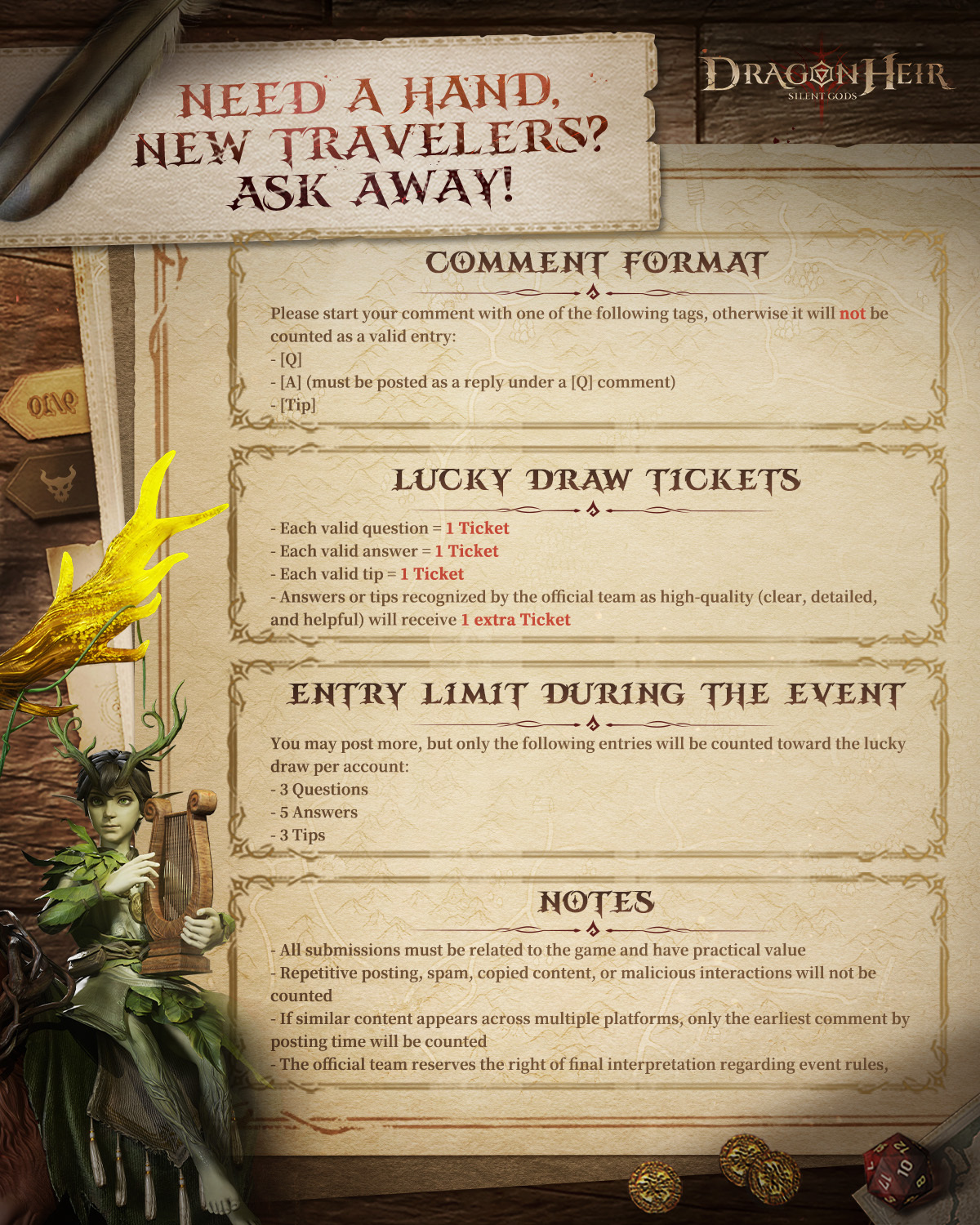 Greetings, brave Travelers! A great gathering of wisdom has arrived!New to this magical world? Ask whatever you wonder — no question is too small to be answered.Seasoned adventurers? Share your knowledge and guide those who just stepped into the realm.Voice your doubts, and guide the new travelers with your aid, or share your battle-proven tactics and secrets for a chance to win amazing rewards!30 lucky travelers will each receive an $8 CDK with:Heliolite Dice ×5, Gold ×5,000,000, Mini Stamina Bread ×2, and Craft Essence ×500. ????Check the event page for full rules, then join the discussion.We can’t wait to hear your curious questions and the wise advice you bring on this journey.Read the full event rules carefully, then join the conversation with your fellow travelers.We look forward to your questions and the timeless wisdom you share in our world.????Download the Reborn version and enter the world:https://dragonheir.sgrastudio.com/???? Explore the official Wiki for guides & tips:https://www.dragonheir.info/#Dragonheir #Dragonheirsilentgods #Reborn #Downloadnow