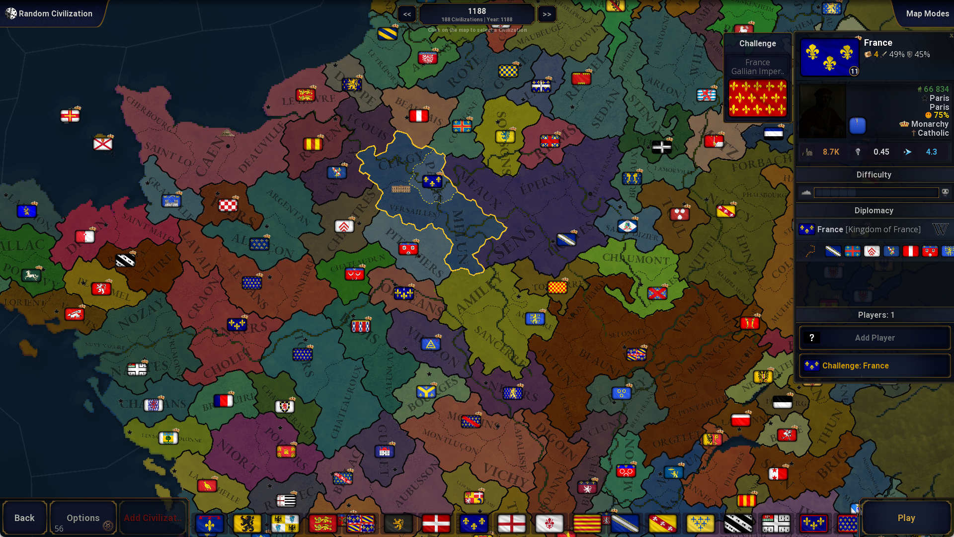 New challenge! France -> Gallian ImperiumIn the year 1188, take control of France and restore the greatness of the Gallian Imperium.