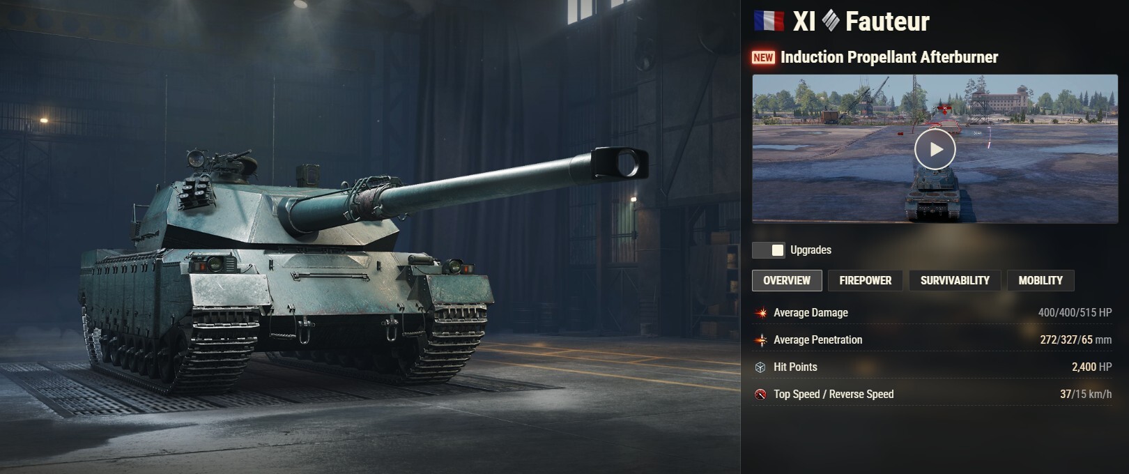 The Fauteur solves the conundrum of its precursor, the AMX M4 mle. 54, which offers an uneasy choice between a precise gun with average alpha damage and a larger-caliber boomstick. The Induction Propellant Afterburner mechanic of the Fauteur passively accumulates electrical charge to increase the damage of the next shot—plus, you can manually override the charge limit for an even mightier (though not so well-aimed) punch.