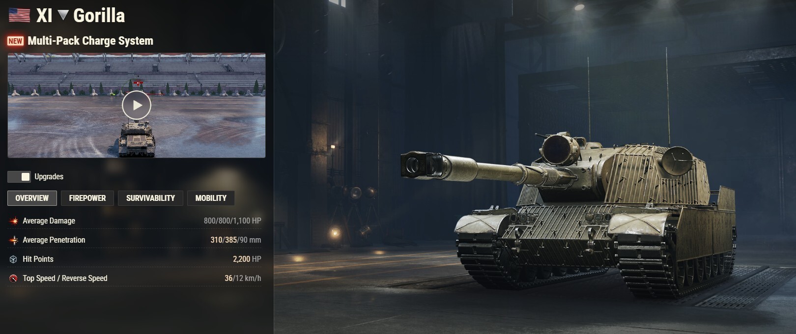 The Gorilla is the successor to the T110E4, inheriting a sturdy partial-rotation turret and a devastating gun—and also long reload time which might make it vulnerable. But unlike its predecessor, the Gorilla has the Multi-Pack Charge System. You can fire long before you fully reload—with less damage and worse penetration but slightly better DPM.