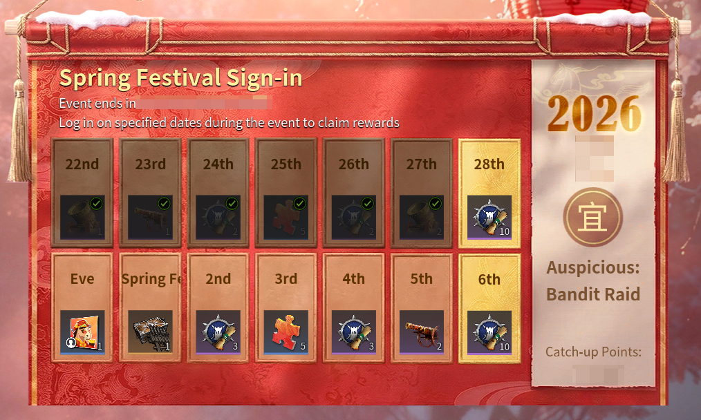 Greetings Warlords, and a victorious New Year to you all!How are you faring with the Spring Festival events?The Year of the Horse events have been in full swing for a week now! With only one day left until New Year's Eve, make sure not to miss out on any rewards. Today, we're doing a final sweep of the "saved for last" benefits — No Unit Kit Loss, Free Doctrine Removal, Double XP... plus a host of events ending soon. Check them out and log in immediately; missing these would be a true pity.Especially for those benefits you care about most — No Kit Loss, Free Doctrine Removal, and Double XP — do not miss out!New Year Privileges: No Kit Loss + Double XPTime: Feb 17, 0:00 – Feb 24, 23:59What is a \[Conqueror's Blade] Spring Festival without zero casualties of units? This is a bona fide "Golden Week for Unit Training"!No Unit Kit Loss: Deploy any Unit you want, take them into battle, and charge without fear!Double Unit XP: Whether it's new seasonal Units or veterans needing levels, take this 8-day opportunity to power level them hard!New Year Free Doctrine RemovalTime: Feb 16, 0:00 – Feb 18, 23:59Free Doctrine Removal comes again! Remove Doctrines for free, swap your lineup, and test new strategies!Don't wait until the event is over to remember; start stripping those Doctrines as soon as the clock strikes midnight on Feb 16!Your Schedule is Ready, WarlordsEpic Mount, 30 Treatises, Exclusive Attire, and Legendary Artillery Boxes are waiting for you!New Year Sign-in (Until Feb 26 Maintenance)Get rewards just for logging in, with catch-up options available! Final rewards include a Legendary Artillery Selection Box (excludes Bombard / Divine Crow), Spring Festival Avatar, Firework Artillery, and Treatise x30.The event lasts 18 days, requires 14 sign-ins, and completing just 12 Matchmaking battles secures all rewards. Even if you're busy during these days, a few matches are all it takes to catch up.New Year Puzzle (Ends Mar 5, drops stop Feb 26)Collect fragments to exchange for the Dagger-Axe Lancers Attire! Sign-in grants 10 fragments, battles drop 60 fragments (weekly cap of 20) — playing 5 matches a week is enough.Fragments can also be purchased with Sovereigns at 50 Sovereigns each (limit 64). Attire collectors, don't miss this.Onslaught (Until Feb 26 Maintenance)The mode returns with new Seasonal Units added. Clear stages to earn points for Divine Crow (Epic), Epic Hero Schematic Crate, Pure Wisdom, Epic Wisdom, and more.If you want free purple Schematics and legendary Artillery, don't forget to obtain enough points these few days.Spring Festival Bazaar (Ends Mar 5, quests stop Feb 26)Epic Mount! Epic Mount! Epic Mount!! Important things must be said three times!Monopoly-style gameplay. Besides the Epic Mount, the core reward is the Brocaded Carp Attire for the Maul. Quests stop at 0:00 on the 26th — only about ten days left. Warlords who haven't secured the weapon skin need to hurry!Red Envelope Rain (Feb 13 – Feb 26)Buy fireworks to participate in the event. Chance to win Pure Wisdom, Treatises, and Rare Schematics. Cumulative purchases grant an Emote selection crate, Title, and Avatar Frame.Additionally, Year of the Horse exclusive attire like the Illusion Orb for Dagger-Axe Lancers and Winged Hussars, a free Bastard Sword effect skin, and Red Envelope Rain — massive benefits await your exploration in-game!May your fortune flourish in the Year of the Horse!(Event details are subject to the actual in-game update. Any adjustments will be announced immediately.)