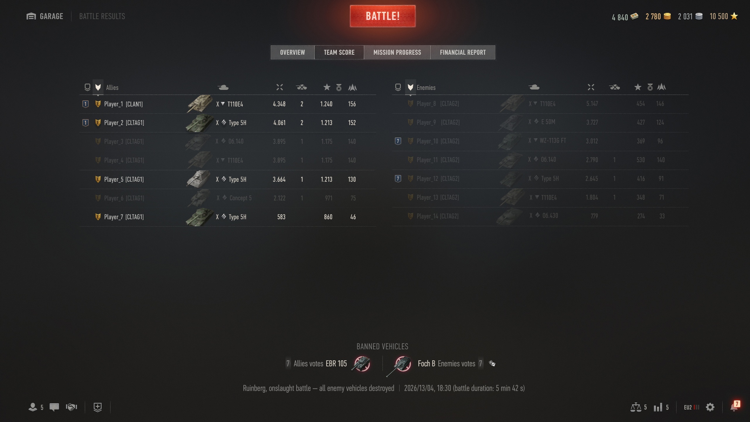 During the pre-battle countdown, players on either team can vote to ban one vehicle. The result is determined by majority vote, while ties are resolved randomly. Banned vehicles, as well as vehicles with identical stats, cannot be used by either team, and the affected player must choose another vehicle. Both teams vote independently, meaning the same or different vehicles—or none at all—may be banned.