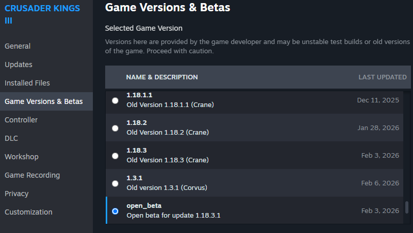 You can enable the beta branch by right-clicking on Crusader Kings III in your library, selecting Properties, then opening the Game Versions & Betas tab and selecting the open_beta branch.