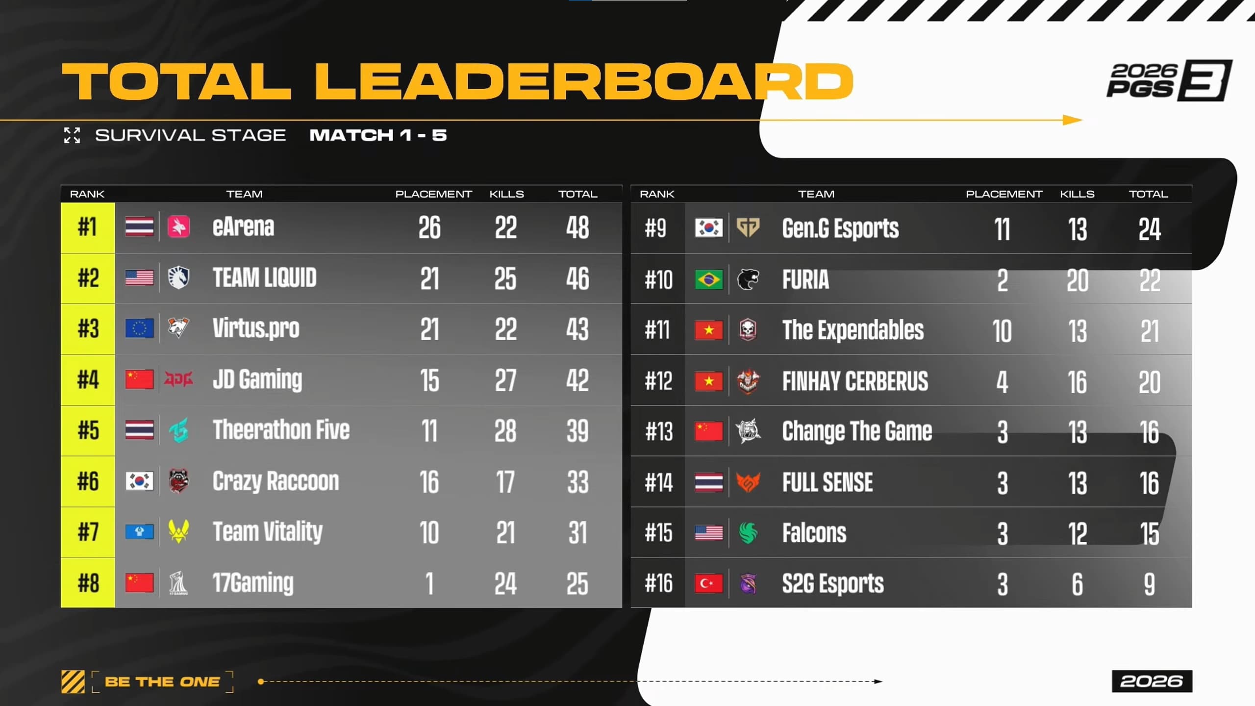 eArena secured its Grand Final berth by finishing first in the Survival Stage with 48 points (26 placement + 22 kills). TEAM LIQUID placed second with 46 points after earning back-to-back Chicken Dinners in Match 2 and Match 3, while Virtus.pro followed in third with 43 points.