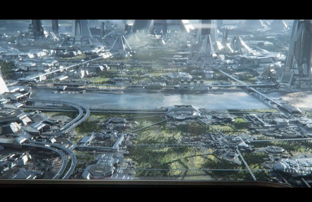 The scene closes with one worker controlling a drone body and failing by getting shot by someone else. The person gets up and exits and sees a futuristic city, while the narrator says, “Now is the time to wait and see. We will be here guiding, protecting. That is our mission.”