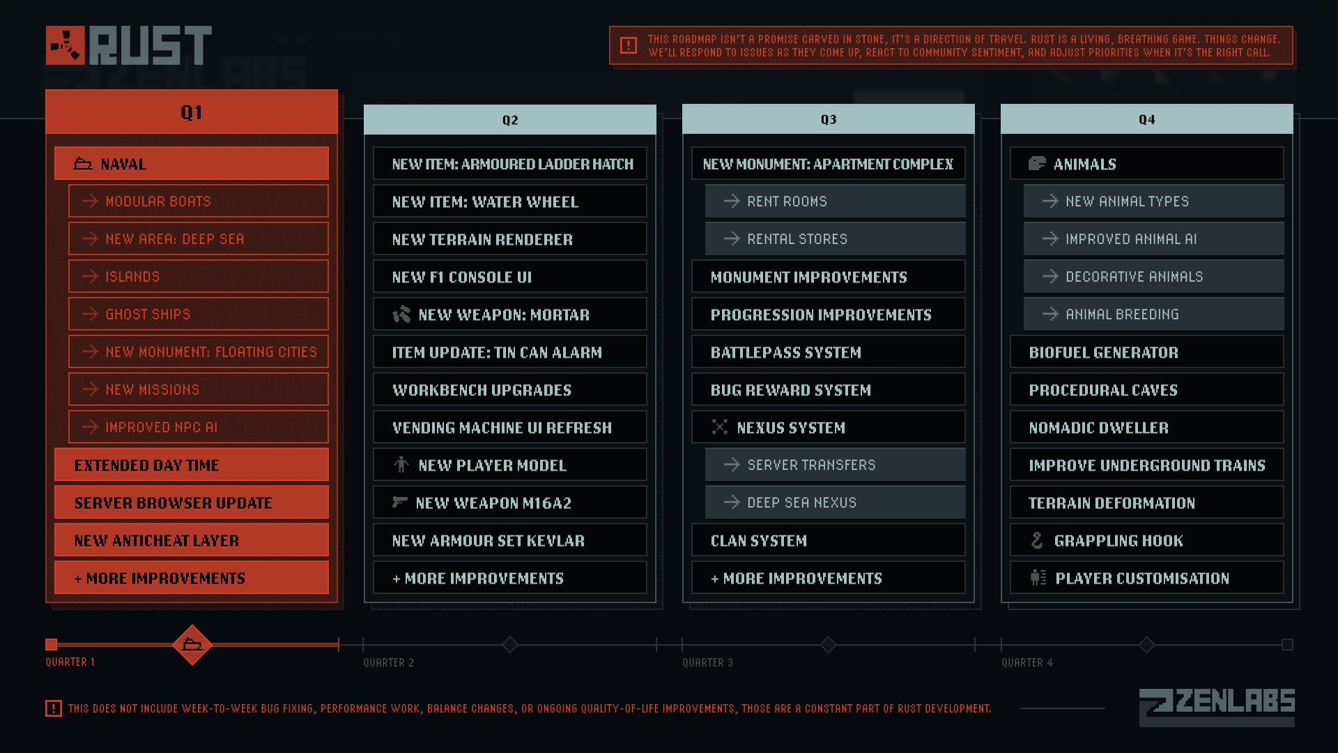 EXTENDED DAYTIMEThis month we've extended the amount of time each day has sunlight by around 20 minutes. The duration of night is unchanged (around 10 minutes). This should hopefully allow for more time for daylight activities while still keeping nighttime tactics viable.BOAT BUILDING IMPROVEMENTS & FIXESThere have been a ton of small fixes and improvements to player boats and boat building this month. I want to a highlight a few of the more common complaints that have been addressed here in this section.Boat building blocks can now be rotated and demolished at any time in edit mode - they are no longer subject to the usual 5 minute timer.The tiny dive site buoys that would bring your full size boat to a complete halt have now been addressed. You may now sail freely!The very annoying issue with sails randomly being destroyed has also been fixed. This was caused by a sail being rotated after initial placement, which sometimes led to them being placed off the edge of a boat. When you then picked something up nearby, the groundwatch triggered and the sails got destroyed. Not any more!Finally, the Deploy & Edit steering wheel option will now always show, even if the current location is unsuitable. An error toast will be displayed if you try to use it, informing you that you cannot edit in this location. There are many reasons why deploy & edit can be unavailable and most of the time the reason is explained, but this one was missing - which led to a lot of confusion previously. Hopefully this will help clear things up!Head to the change list for the full details!DEEP SEA CHANGESWe made a number of balancing changes and improvements to the Deep Sea.Loot now respawns slowly over time. The initial loot fill when the Deep Sea opens has been decreased to around 70% of what it was.The side of the map it spawns on is now random after each opening.The deep sea will no longer open right after the server wipes.You can’t go there using RHIBs now.A notification sound will play when the deep sea opens.All these changes can be configured via new convars. We’ve also increased the network range from 300 to 620 metres in the Deep Sea, so you can spot ships from much further away. We can’t afford to do that on the mainland because of player and entity density, but out at sea we have enough performance headroom to support it.Thanks to everyone for sharing their thoughts about their experience with the Deep Sea since its release.CANNON HIT MOVEMENT PENALTYWe've added a movement penalty for player built boats that are hit by cannons. Repeated hits can reduce a ship's movement speed to 30% of its maximum speed. We'll keep an eye on how this plays out, but our hope is that this leads to more interesting ship to ship combat as well as some more boarding action.We've also buffed the player protection while mounted to cannons so players shouldn't be as vulnerable while using them.ELECTRICITY, INDUSTRIAL, AND WATER IO ON BOATSYou can now use electricity, industrial and water IO items on boats. Almost all the items are available. Some of them are more involved to support than others, for performance or various other reasons. Some of them are blocked purely for gameplay balance concerns.Blocked items: Auto turretSAM siteWindmillCCTV camerasSeismic sensorHanging lightsDoor controller, hopperAll subject to change in the future!WALLPAPER ON BOATSYou can now use wallpaper on boats, the same way as in your base.DESTRUCTIBLE BOAT WRECKSSunken player-built boats can now be damaged block by block, allowing for exploration and loot recovery.PLAYER BUILT BOAT DECAY CHANGESI've made some changes to decay rates, based on player feedback.Decay delay has been doubled from 12 hours to 24 hours and decay duration has been reduced from 18 hours to 12 hours.This will mean players can stay offline for longer without their boat decaying, but abandoned boats will decay quicker.As a reminder, a player boat is only classed as used when it receiving steering wheel input.STORAGE BOX PACK DLCShipping this month is the Storage Box Pack, a packed-out collection of 16 uniquely designed and labelled skins for the Large Wood Box. Featuring bespoke and beautiful designs for Ammo, Armor, Charcoal, Clothing, Components, Explosives, Food, Guns, Meds, Metal, Ore, Scrap, Stone, Sulfur, Tools and Wood.Each box also has a special functionality where they show the contents as a distinctive stack of items. Never fear though, the contents are not visible to hostiles unless your auth is destroyed! Get them boxed up from the in-game store or from the Rust item store!DEPLOYABLE SNAPPING ON BOATSYou can now use deployable snapping on player built boats! This works as you'd expect. Hold a relevant deployable and left shift whilst on a player boat. This works for the exact same set of deployables as it does on land.PLAYER BOAT AIM SWAYWe've added a moderate amount of ADS aim sway while on player built boats, scaled by the speed of the boat. Ideally this encourages the use of cannons over