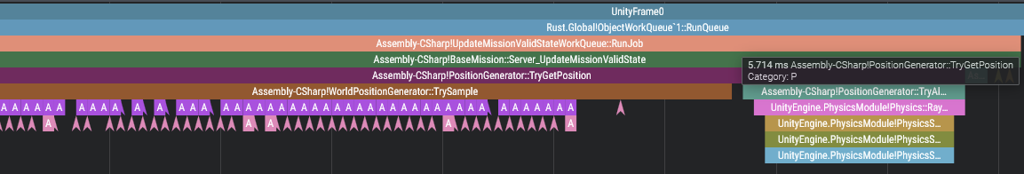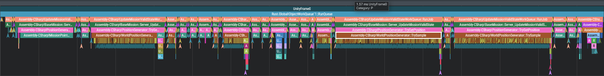 To summarise, part of that process would iterate over thousands of potential areas of the map, before passing these initially found potential areas to a second filter, pulling randomly until we find one which we can generate a valid position from. This is something which would have always been problematic every time we we started one of those types of missions, but was only exposed in this way because we moved the work to run in a work queue, and more frequently than before as we are now polling the mission regularly rather than only when a player tries to start that mission.