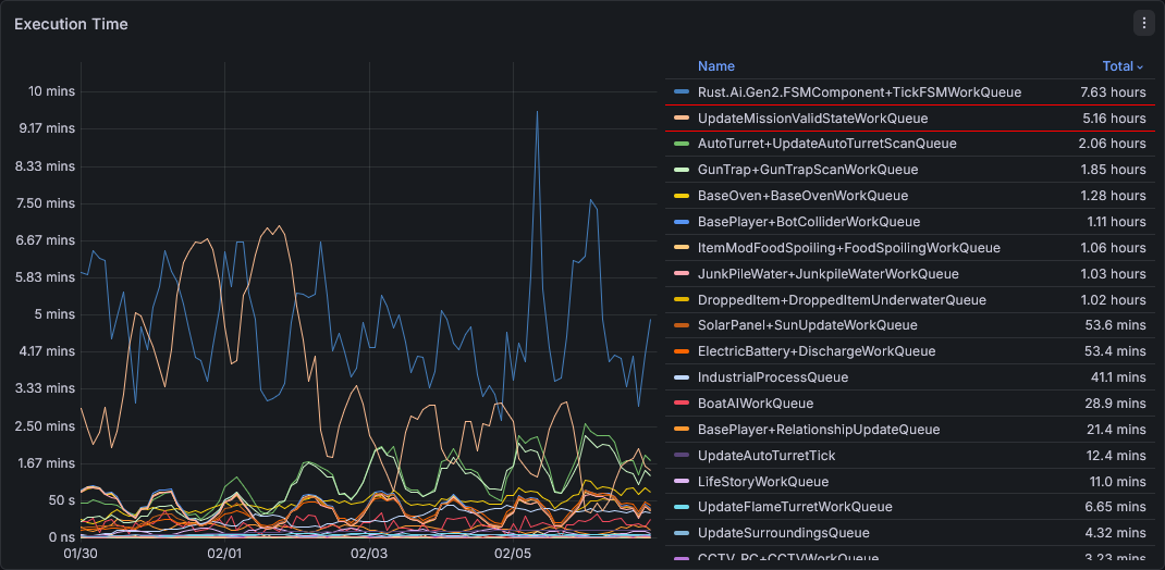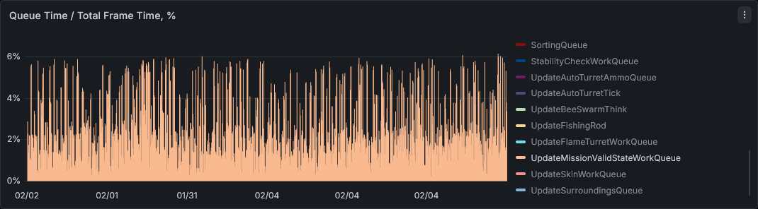 After releasing the naval update, we were seeing that this new work queue was too expensive. We were also seeing some expensive RPC frametime spikes when players go to talk to NPC's (when a player talks to an NPC, the server performs a complete revalidation of that NPC's missions and checks that specific players mission prerequisites, so that they have the most up to date information to display the correct dialogue options). Data from our EU Staging server shows that the work queue was second place in terms of time spent executing (data captured across 7 days after the naval staging wipe). It was also accounting for up to 6% of our total frametime.