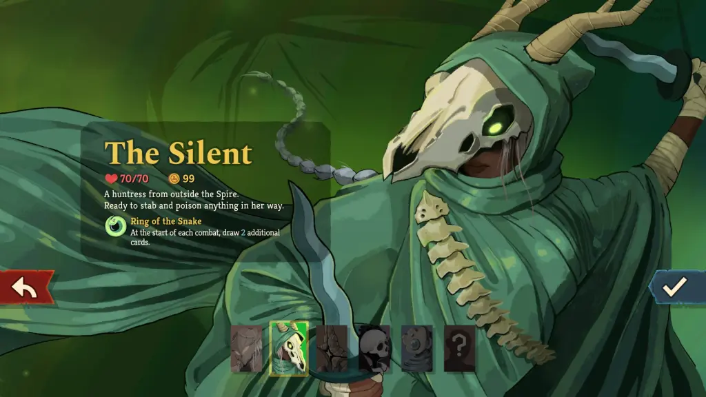 Screenshot by Destructoid The Silent offers one of the best damage potentials among all characters. The Silent is well-suited to take down the strongest of enemies in a few blows. Unlike Ironclad, the Silent has dedicated means of doing damage, which only gets better in the latter stages.If you're somone who loves to play with bigger decks, Silent will allow you to get two extra cards at the end of every combat. Having a bigger deck has its own set of strengths and weaknesses. For beginners, a bigger deck might not be great. At 70, the Silent has the second-lowest starting health pool.