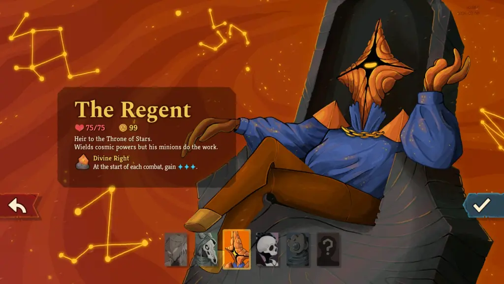 Screenshot by Destructoid The Regent isn't the easiest of characters to master. Unlike the other characters, the Regent's strength lies in the use of stars. You begin every combat with three of them. You'll have to build a deck that allows you to get more stars. You can then use the stars to land powerful spells. Some of them can even do serious damage and give you more stars if it results in a casualty.As long as you can manage your basic cards well, gain stars consistently, and know how to use them, the Regent is an extremely fun character. With 75 health, he can take a few hits if you don't get your blocks up in time.