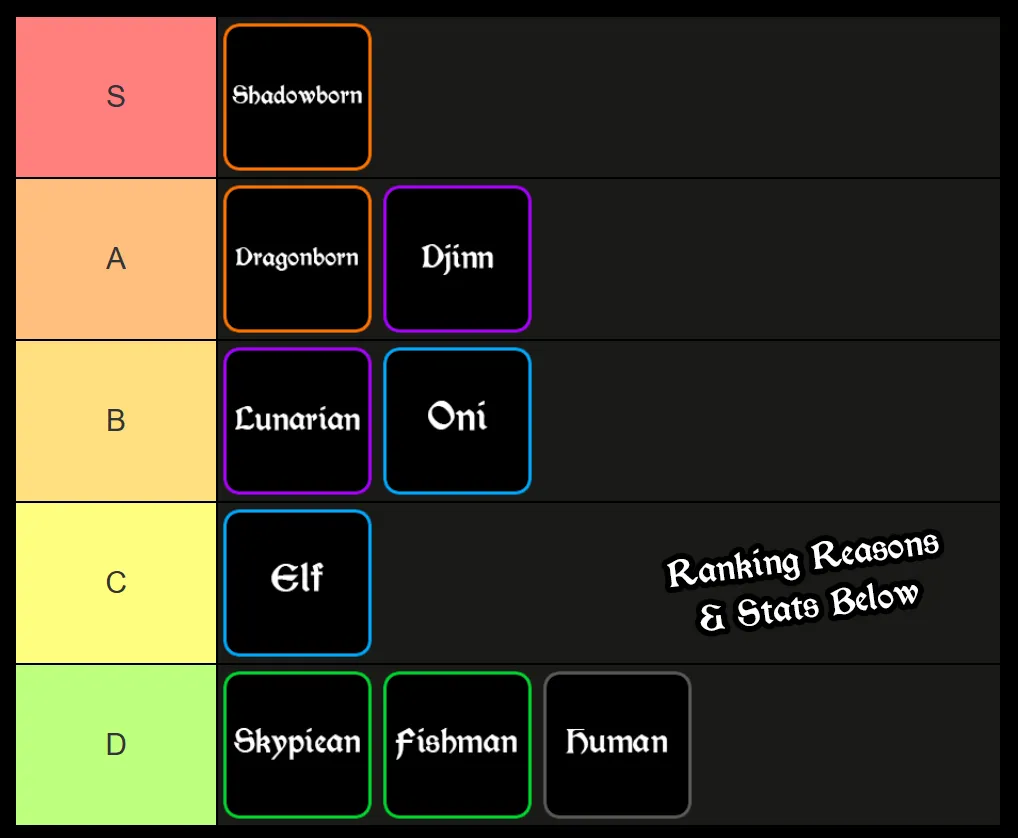 Weapon Stances or Masteries as well as Races are heavily tied together in Slime Seas. I'll be ranking all of them so that you can create the best build possible for both PVP and PVE. Also, check out the FAQ at the end for a bunch of useful tips. Here's my Slime Seas Race and Weapon tier list.Table of contentsSlime Seas Race Tier ListS-Tier RacesA-Tier RacesB-Tier RacesC-Tier RacesD-Tier RacesSlime Seas Weapon Stance Tier ListSlime Seas FAQSlime Seas Race Tier List Image by Destructoid The best race in Slime Seas depends on what weapon you're using and your playstyle. Above you'll see the rankings for all races in general and below you'll find the best race for each weapon and also ranking breakdowns and stats for each race. Then we'll move into the best Stances/Masteries below. Best Race By WeaponGreatsword & Berserker: Dragonborn > OniScythe: Dragonborn > DjinnKatana: Shadowborn > Lunarian S-Tier RacesS-Tier RacesRanking ReasonsRace StatsShadowborn Legendary • The highest DPS potential for Katana builds with the best mobility• Plus you have lifesteal which in combination with Parries and Dodges makes you unkillable• Best damage and sustain in the game for both PVP and PVE+5% Life Steal+35% Katana-50% Greatsword & Scythe+40% Dash Distance+15% Movement Speed-25% Max HealthA-Tier RacesA-Tier RacesRanking ReasonsRace StatsDragonborn Legendary • The best Greatsword/Scythe race with near-best DPS due to the skill cooldown reduction and fire damage• That said while you have more HP, you have less mobility and no lifesteal so I ranked Shadow higher• Still Dragonborn is the second-best race in the game and if you have high base Fire damage it can compete with SB DPS wise+15% Skill Cooldown Speed+25% Max Health+20% Scythe Damage+10% Fire Damage+20% Greatsword DamageDjinn Fabled (Epic) • The third best race in the game and the second-best for Scythe with a great mix of DPS boosts• I value skill cooldown reduction over health and speed so I put it above Lunarian+15% Skill Cooldown Speed+20% Scythe Damage+25% Dash DistanceB-Tier RacesB-Tier RacesRanking ReasonsRace StatsLunarian Fabled (Epic) • Competes for the third-best race in the game if you have base Fire damage• In fact it's the second-best race in the game for Katana builds• That said Djinn has cooldowns which can out-DPS Lunarian in duels+10% Movement Speed+10% Max Health+20% Katana Damage+10% Fire DamageOni Rare • With no Fire damage boost Oni still has a 20% damage boost for greatswords+15% Max Health+20% Greatsword Damage-5% Movement SpeedC-Tier RacesC-Tier RacesRanking ReasonsRace StatsElf Rare • Lacks the 20% weapon damage boost but the skill cooldowns save it from D-Tier+10% Skill Cooldown Speed+10% Movement Speed+10% Katana DamageD-Tier RacesD-Tier RacesRanking ReasonsRace StatsFishman Uncommon • Great beginner race for greatswords+50% Swim Speed+10% Greatsword DamageSkypiean Uncommon • Great beginner race for katanas+10% Katana Damage+10% Movement SpeedHumanCommon• Not worth it IMO+5% XP GainSlime Seas Weapon Stance Tier List Image by Destructoid The best Weapon/Stance/Mastery in Slime Seas depends on which race you're going for. This is the case in both PVP and PVE. Above you'll see the best weapon based on the race you have. The second-best weapon is just every other weapon but it's not worth it since you don't get the damage boost. The only exception is Shadowborn where you shouldn't use Greatswords and Scythes due to a massive debuff. As for PVP, here are the skill damage breakdowns for all weapons:Katana Skill Damage (PVP)Flashblade Surge (Mastery 0) - 800 DamageSurge Wave (Mastery 3) - 1,600 DamageThousand Slashes (Mastery 5) - 2,700 DamageScythe Skill Damage (PVP)Death’s Grasp (Mastery 0) - 700 DamageSpinning Strike (Mastery 3) - 1,300 DamageVoid Surge (Mastery 5) - 1,200 DamageGreatsword Skill Damage (PVP)Earth Breaker (Mastery 0) - 900 DamageSweeping Slam (Mastery 3) - 1,300 DamageSpiraling (Mastery 5) - 1,700 DamageBerserker Skill Damage (PVP)Impaling Thrust (Mastery 0) - 1,200 DamageLeaping Slam (Mastery 3) - 900 DamageColossal Slam (Mastery 5) - 1,200 Damage In PVP, your stats are limited to 10,000 Health and 325 Melee Damage while ability damage varies per Weapon. Slime Seas FAQHow to reroll Races in Slime Seas? You can get a race by clicking on the Stats menu and then tapping on the Race button in the top left. You can get Race Rerolls via Robux, from the wheel or codes (linked below). How to get all Weapon Stances in Slime Seas? Greatsword & Katana: Available at almost all shops starting from the first island.Scythe: You can only get the Scythe after reaching level 200 either from the Merchant Shop or by opening chests.Berserker: This is a Robux-only Weapon Stance available either via the Shop or by talking to any Guts/Berserker/Black Swordsman NPC. What is the best weapon in Slime Seas? The best weapon in Slime Seas is simply the highest damage weapon you can buy for your Weapon Stance. This game is based on linear/incremental progressi