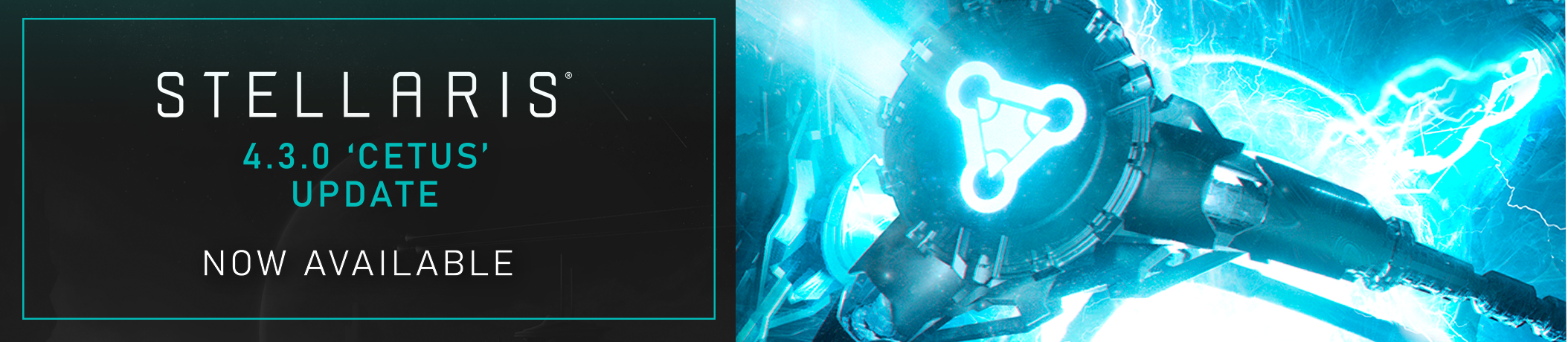 The Stellaris 4.3 “Cetus” update is now available!Internally referred to as “The Reckoning”, the “Cetus” patch boasts an impressive list of balance changes, fixes and performance improvements, while cutting back on the supercharged navies and economies that were introduced with Stellaris 4.0.Cetus Design Goals and Philosophy4.3 “Cetus” is not looking to re-create the economic and power balance of 3.x, but rather we’re establishing a new baseline of where the 4.x economy should be. The smaller economies and navies in 4.3 “Cetus” will reinvigorate early-game and mid-game challenges, adding more incentive to do things like Pacify Space Fauna, which might otherwise be a challenging barrier to bypass.Over the course of the Open Beta we iterated over a good many of these mechanics and balance changes, some things were reworked due to Community feedback, and other things were removed entirely. Behind the scenes the Custodian programmers focused heavily on performance and stability. You should find the game significantly faster and more stable from the very start until the end-game. Thanks to everyone who left feedback and bug reports for us during the Open Beta!Naval Capacity ChangesWe have made significant changes to Navies intended to reduce the overall ship counts, and we feel that the reduced ship counts make individual ships feel more valuable and interesting. Decoupling ships' Naval Capacity usage from the Corvette Standard™ has given us the opportunity to do things like give Frigates their own niche between Corvettes and Destroyers.Economic ChangesMajor changes have been made to the economy to rebalance it to a lower level, with reductions across the board to unity generation, planetary ascensions, per pop jobs, and more.Ascensions and OriginsWe did a pass on many Ascension Paths and Origins to bring them more in-line with each other balance-wise. Cybernetics will become a little stronger relative to the other Ascensions, while Psionic and Biological Ascension Paths have had some of their runaway production bonuses toned down. Similarly, the early Ascension Origins have also received particular attention, with the objective of pushing their Ascension later into the game.Read the full patch notes here.We hope you enjoy Stellaris 4.3 'Cetus' as much as we enjoyed bringing it to you. Thank you all for playing Stellaris!