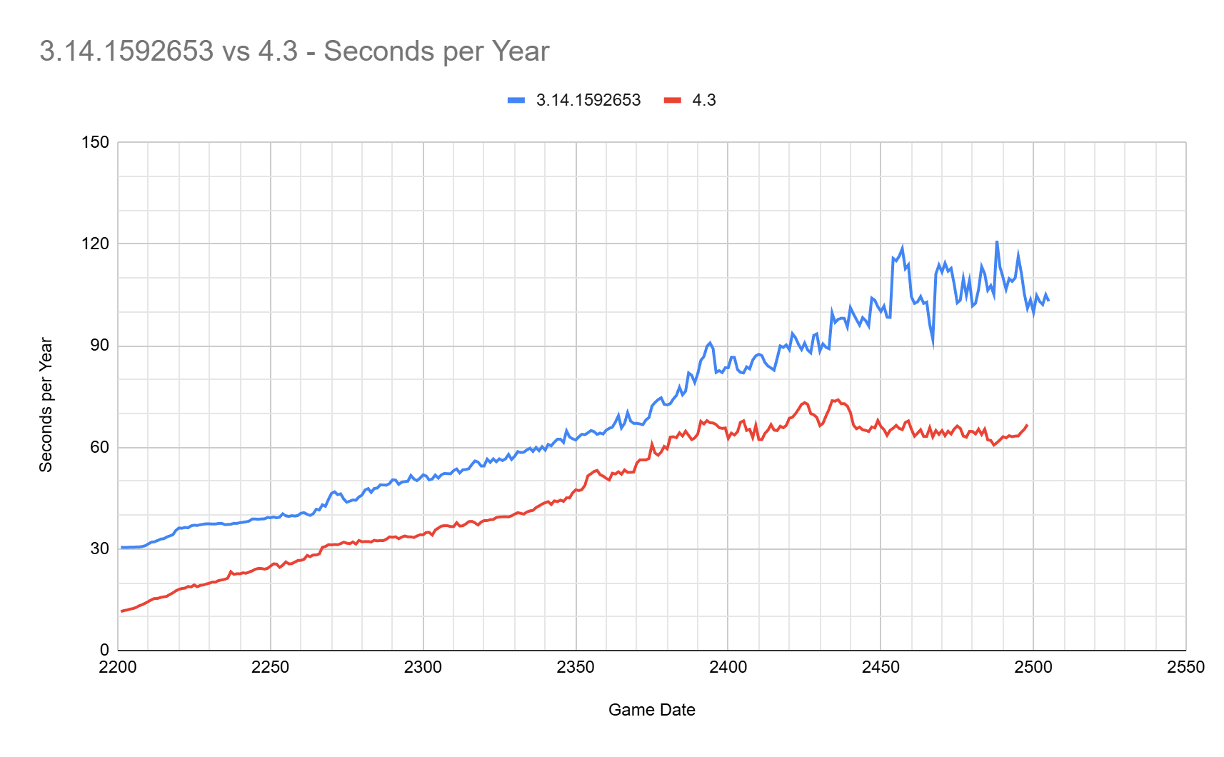 The 3.14 build started at 30.52 seconds per year, while our 4.3 build started faster than a month per second at 11.54. It took until 2269 for 4.3 to slow down to 3.14’s starting time, by which point 3.14 was taking 44.63 seconds per year.
