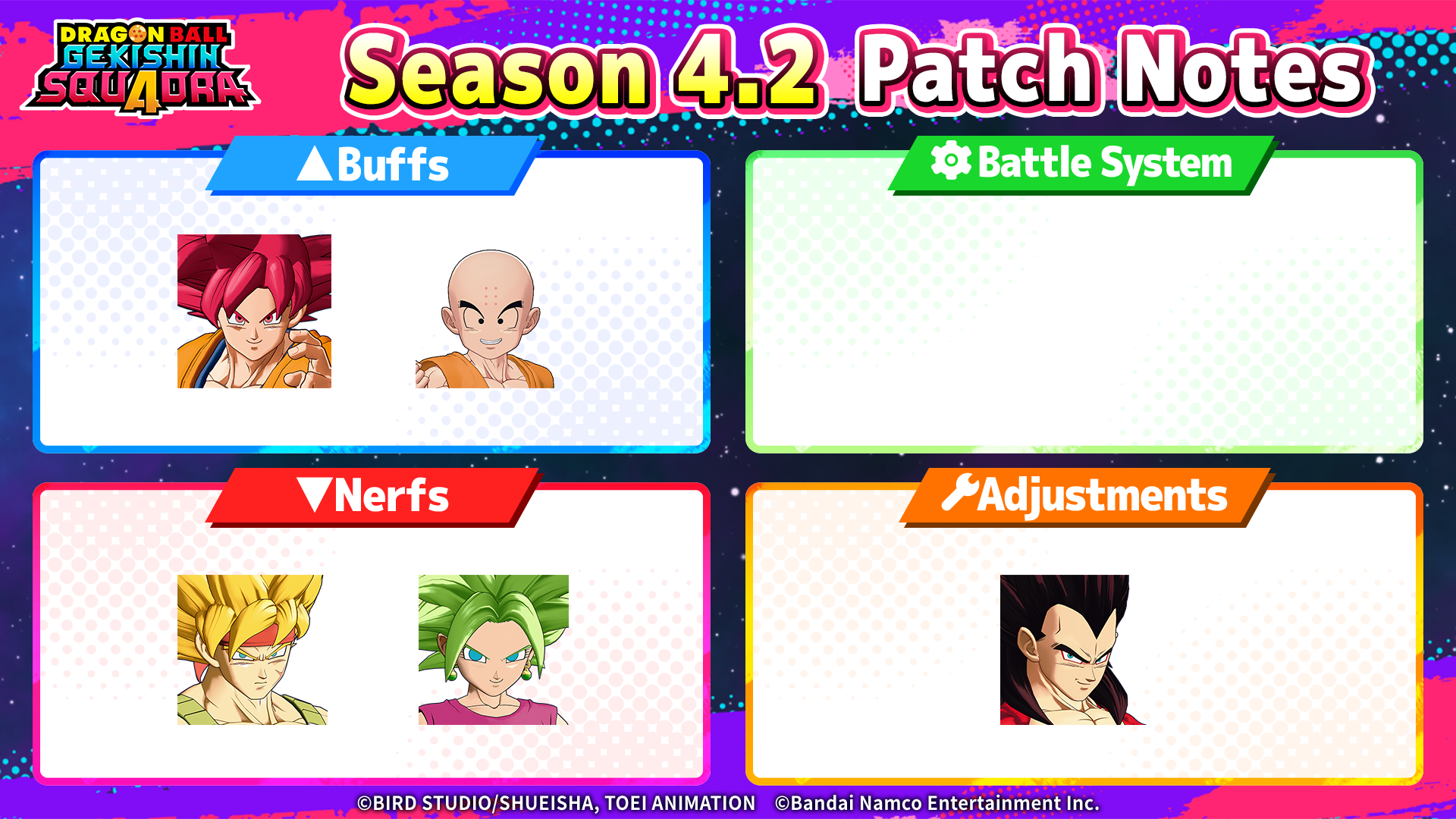 Super Saiyan God Vegeta and New Customizations Are Here!─────────────────────────────────────────────────────────────────────Another Super Saiyan God Is Here!We also have info on exclusive customizations and deals on Capsules!─────────────────────────────────────────────────────────────────────■A New Hero Arrives!Super Saiyan God Vegeta (Role: Tank)A divine guardian who supports his team by drawing enemy attention on the frontlines.Warp to a set position in the sky and stagger enemies with an explosive energy wave using his Super Attack, "God Shine Attack"!Raise your Red Fury in battle, create attack openings, and seize victory!■Limited-Time Only! New Hero Focus Capsule!Get customizations for Super Saiyan God Vegeta!Legendary・Divine Flames Scorching the Heavens (Emote: Start)・Straight Punch (Finisher Attack Effects)And there will also be Epic and Rare emotes!Buy the exclusive FG-Capsule Set in the shop to get the new hero and 3 FG-Capsules for customization!And you can also purchase an exclusive individual FG-Capsule once per day!Use this chance to customize your new hero!Exclusive FG-Capsule Set Sale Period:2026/04/01 15:00 – 2026/04/08 14:59Exclusive Individual FG-Capsule Sale Period (Limit 1 per day):Apr 1 2026, 6:00 AM – Apr 20 2026, 5:59 AM (UTC)Capsule Period:Apr 1 2026, 6:00 AM – Apr 22 2026, 5:59 AM (UTC)*Important Notes*・The FG-Capsule Set and FG-Capsule this time will be exclusive to Super Saiyan God Vegeta.・The sale period for the set will be shorter than the Capsule period.・Make use of all your FG-Capsules during this period.・Unused items will disappear after the Capsule period is over.■A Special G-Capsule with New Emotes and Effects!A New Hero Focus Capsule is here!A featured selection of Super Saiyan God Vegeta emotes and effects, as well as Super Vegito's Core-Breaking Flash (Team Finisher Effect), is here for a limited time!Liven up your battles with the latest customizations!Featured Period:Apr 1 2026, 6:00 AM – Apr 22 2026, 5:59 AM (UTC)*Important Notes*・New emotes and effects have also been added to the "Prize Season 4" Prize G-Capsule.・After the end of the featured period, the following emotes and effects will be temporarily unavailable through the "Prize Season 4" Special G-Capsule.▼Super Saiyan 2 Kefla・Birth of a New Super Warrior! (Emote: Start)・Sonic Fist (Finisher Attack Effects)▼Super Saiyan 4 Vegeta・Full Moon Oath (Emote: MVP)■Super Saiyan God Vegeta's New "God Battle Suit (Torn)" Skin Arrives in the Shop!Fight to the end with unwavering pride, even in this worn-down battle suit!─────────────────────────────────────────────────────────────────────Season 4.2 Patch Notes Now Available!Check here for a roundup of all the adjustments implemented with the start of Season 4.2.https://dbg-squadra.bn-ent.net/en-us/news/9_m8cc8v3─────────────────────────────────────────────────────────────────────A login bonus, events, and special sales are now all underway to celebrate the Half-Anniversary!We hope you continue to enjoy Season 4 of SQUADRA!