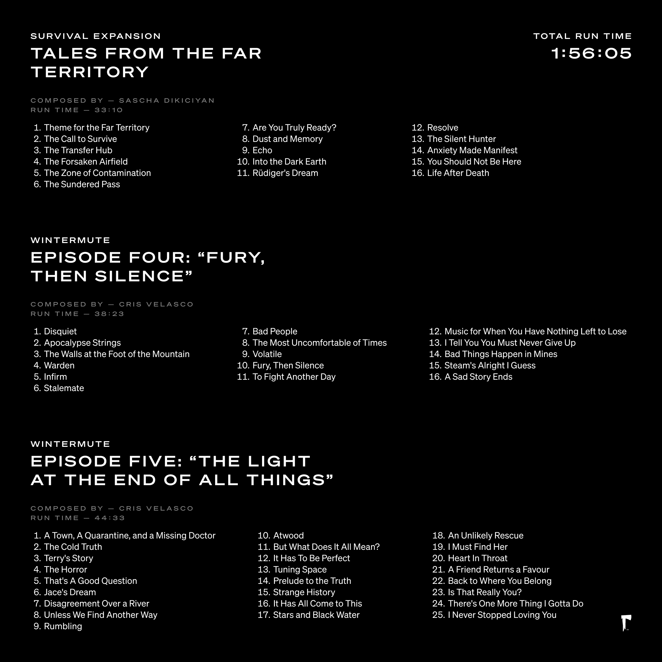 Volume 3 offers nearly 2 hours of original music composed by Cris Velasco (Story Mode) and Sascha Dikiciyan (Survival Mode), and covers EPISODE FOUR: FURY, THEN SILENCE, EPISODE FIVE: THE LIGHT AT THE END OF ALL THINGS, and TALES FROM THE FAR TERRITORY.