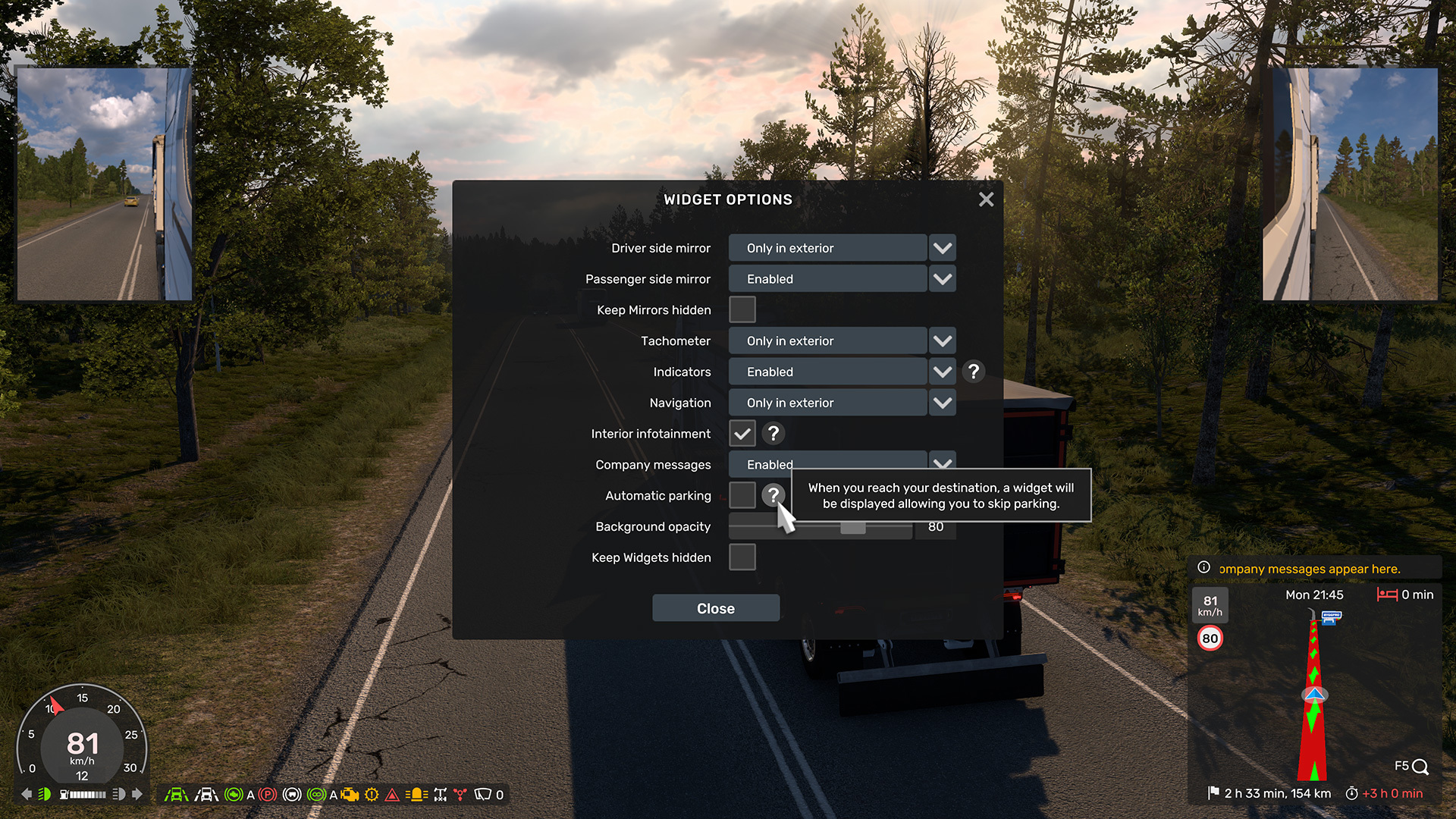For more than a decade, the Route Advisor has been a constant companion on the road. It’s been with many of you for thousands of hours, countless deliveries, and more than a few white-knuckle parking attempts. Changing something so familiar is never a small decision, and it’s not one we took lightly. So before we talk about what changed, we want to start with the most important question:Why did we change the Route Advisor at all? Over the years, the core truck driving experience has grown deeper and more detailed. Trucks gained more systems. Driving assists became more nuanced. Screens got smaller for some players, larger for others, and control methods expanded from keyboards to wheels and gamepads.The original Route Advisor did an incredible job for a long time, but it was reaching a point where it could no longer grow without becoming cluttered, unclear, or restrictive. Adding more and more information into a single panel meant compromises: hidden states, missing feedback, and tab switching while driving.Our goal with the new Route Advisor was not to change how you enjoy truck driving. It was to make sure the information you need while driving is:ClearImmediateUnambiguousAdaptable to how you play What you’re seeing now is the foundation of that change.From One Panel to Many: A Widget-Based AdvisorInstead of one compact panel trying to do everything, the new Route Advisor is built from individual widgets, each with a single, clear purpose.This shift lets us do three important things for truck drivers:Show more driving-critical information without crowdingGive clear feedback on what your truck is actually doingLet you decide what stays on screen, and what doesn’tEach widget can be enabled or disabled independently, and you can choose whether it appears:in the interior viewthe exterior viewbothor not at allIf you want a minimal, immersive screen, great. If you want more at-a-glance feedback, also great. Furthermore, F3 remains as before to switch off all UI elements with notifications still being shown.Driving-Critical Information, Front and CentreOne of our biggest focuses was improving feedback while driving, especially information that previously was missing, unclear, or only available in limited views.What is now more visible and easier to read: SpeedSelected gearFuel statusTime to rest What is now displayed for the first time:Engine RPMExact time until rest is requiredTime remaining to complete a deliveryTruck systems indicators This information is available whether you’re driving from the cabin or using an exterior camera, so you’re never guessing what your truck is doing.Clear Feedback on Truck SystemsModern trucks rely on many active systems, but until now, it wasn’t always obvious which ones were on, off, or partially engaged. The new Indicators widget provides immediate visual feedback for systems such as:Cruise control (including its settings)Engine brake and retarder levelsLane assist and lane departure warningLights, high beams, hazards, beaconsParking brake, trailer brake, differential lockWipers and air brake pressureIcons appear only when systems are active, keeping the screen clean while ensuring nothing important is hidden. A Better Way to Understand DamageDamage feedback has also been reworked.Previously, damage was shown mainly as percentages, but those numbers didn’t always explain what that damage actually meant. Now, instead of an abstract value, the UI shows when a system is damaged enough to start malfunctioning.In other words:You don’t just know that something is damagedYou know when new damage occurs, with the change clearly highlightedYou know when it will start affecting how your truck behavesThis gives clearer feedback and a better sense of urgency, without unnecessary distraction.Notifications That Inform Without OverwhelmingNotifications now live in a dedicated area of the screen and are colour-coded by importance: AlertsWarningsAnnouncementsOnly one notification appears at a time, helping you stay informed without flooding your view. This also prevents important messages from fighting for attention in multiple places.Automatic Parking, Refined Automatic parking assistance has been redesigned to be less intrusive and more optional.Instead of repeated reminders in a distracting block of text, it now appears as a small, dedicated widget (highlighted below) that subtly communicates the option clearly, and can be disabled entirely by experienced drivers who don’t need it.The Role of the Quick Info MenuSome information has been intentionally moved away from the live driving HUD to reduce distraction:Detailed job informationDamage percentagesVehicle adjustments and servicesThis information is now centralised in the Quick Info menu, alongside: Control referencesEasier access to settingsPhoto modeWidget Options Local regulationsThe intent here is separation:Driving HUD → what you need while drivingQuick Info menu → deeper context and configurationThis Is a Foundation, Not a Final