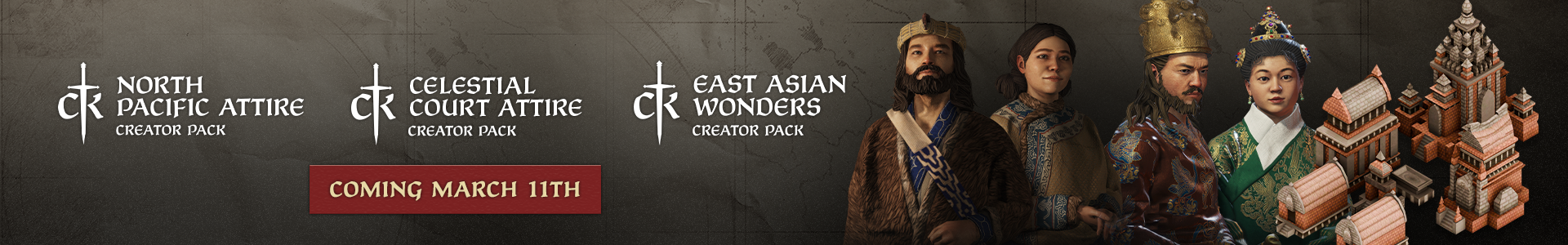 Coming March 11, 2026.Three new Creator Packs for Crusader Kings III bring grand monuments of Asia to your map, historical flair to your court, and the highest fashions of the grandest hegemon.Crusader Kings III North Pacific Attire Creator PackAdd more historical fashion and flair to your Crusader Kings III characters with the North Pacific Attire Creator Pack, a new cosmetic addition to the game from community modder Adrian "Aj" Kamil, who also created the Arctic Attire Creator Pack.The North Pacific Attire Pack includes new clothing and buildings themed around the people of northern Japan, the Sakhalin islands and coastal Siberia.This pack includes:10 Ainu and Emishi-inspired clothes with 18 unique variants3 East-Arctic and Nivkh clothes with 8 unique variants1 armor set (headgear & armor)2 legwear models for both common and noble characters1 straw cape8 hats with 11 unique variants9 new buildings, including temples, tribal settlements and walls1 unit set consisting of 3 modelshttps://store.steampowered.com/app/3315580/Crusader Kings III: East Asian Wonders Creator PackSee the grand monuments of Asia on your Crusader Kings III map with the East Asian Wonders Creator Pack, a new community creation from modder Pietro "PiGu" Cavalli. This cosmetic pack adds on-map representations of 22 iconic sites and locations, bringing new flavor and majesty to your game.The following Asian structures and landmarks are included:Great Buddha of KamakuraKizuki TaishaStone Pagoda of MireuksaTomb of a Goguryeo KingIron Lion of CangzhouTemple of ConfuciusGaocheng ObservatoryMaijishan GrottoesYuelu AcademyImperial Citadel of Lin'anFanfang of GuangzhouMy Son SanctuaryHa Long BayThree Pagodas of DaliThuriang KilnsLingapura Pyramid Candi of Muara TakusWilwatikta PalaceGunung ApiSlopes of RussetSulawesi MegalithsThis pack also includes a representation of the temple city of Angkor, with the celebrated Angkor Wat complex.https://store.steampowered.com/app/4232860/Crusader Kings III Celestial Court Attire Creator PackClothe your court in the highest fashions of the grandest hegemon with the Celestial Court Attire Creator Pack for Crusader Kings III. Created by modder TAMA, this pack includes new clothing for medieval China and many of the cultures that circled it, including clothing from Central Asia, Korea, the southwestern borderlands of Dali and more.The Celestial Court Attie Creator Pack includes:Two clothing designs and one headdress from the Ming DynastyMing Nobility Clothing1 Ming Noble's Dress1 Hairpin Crown of Ming DynastyFour clothing designs, two headdresses, and one hairstyle from Uyghur culture:2 Uyghur Royal Robes, available in both high and low grades2 Women's Crown of Uyghur, available in gold and silver1 Men's Crown of Uyghur1 Noble Hat of Uyghur1 Uyghur Braided HairTwo clothing designs, one headdress, and one waist Ornament from Tangut culture:2 Tangut High Nobility Clothing: Includes two styles, high and low.1 Noblewoman's Hats of Tangut: Includes two styles, high and low.1 Western Xia male waist ornament (tied on a round-necked robe)Two clothing designs and four headdresses from Khitan culture:1 Male Liao Nobility Clothing1 Female Liao Nobility Clothing1 Khitan Crown with High Wings1 Liao Golden Crown2 Liao Noble's Hats: Includes two styles, high and low.One clothing design and two headdresses from Dali:1 Dali Nobility Clothing1 Dali High Noble Crown1 Dali Low Noble's HatTwo headdresses from Jurchen culture:1 Noblewoman's Hat of Jin Dynasty1 Noble Hat of Jin DynastyTwo headdresses from Silla:2 Crowns of Sillahttps://store.steampowered.com/app/4232870/North Pacific Attire, East Asian Wonders and Celestial Court Attire will all be available March 11th!