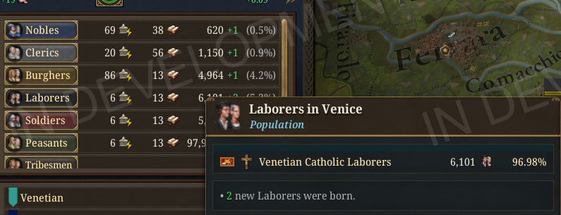 One of the most fundamental changes in this update is how populations grow and evolve in Europa Universalis V. Previously, all population growth was entirely on peasants, and getting other pop types was driven entirely by promotion, pops moving up the social ladder from one type to another. We've now given each pop type its own organic growth rate, meaning peasants, burghers, nobles, clergy, and tribespeople all reproduce and expand naturally over time, independent of promotion. Slaves are the exception, they remain a coerced population whose numbers are determined entirely by the slave trade and forced migration, not by natural increase. There are different reforms, and other things that impact the growth of specific types of pops.