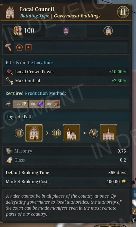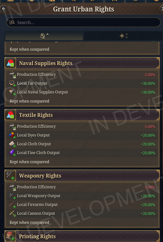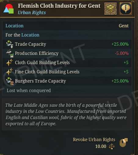 Granting an urban right costs 5 government power (legitimacy, republican tradition, etc), but revoking one is far more painful, as it costs 10 stability and will deeply anger the burghers who lived under those privileges. Most rights are also lost when a location is conquered, so enemy rulers cannot simply inherit your carefully built legal framework. Some rights are mutually exclusive with others in the same location, so you'll need to choose which economic identity suits each city best. Managing your urban rights is a core part of shaping your realm's economic specialization and regional identity over time. A Town can have 1 urban right, while a city can get 2 urban rights, and capitals have 1 more available.