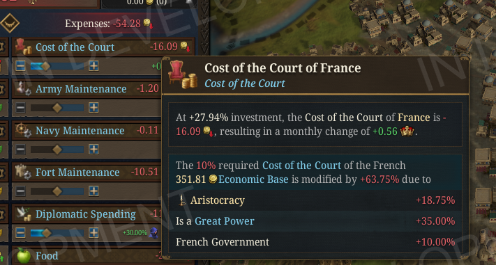 Court upkeep used to be a simple fixed percentage of your Economic Base, and modifiers changed that with a straight + or - percentage, which made each thing impacting it insanely harsh or beneficial.