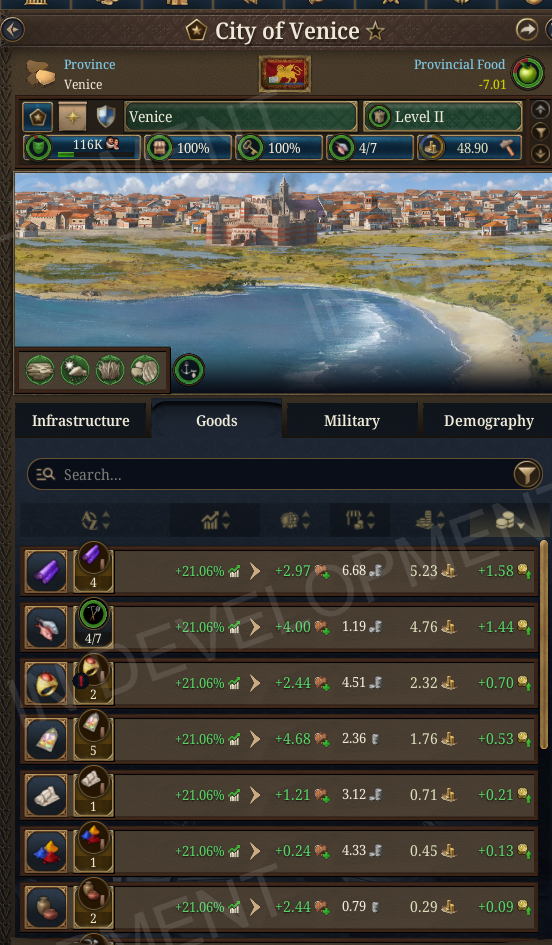 The location view now has a dedicated Goods tab, together with the infrastructure, military and demographics tab, giving you a production analytics view for that specific province at a glance. For each good produced at the location, you can see which buildings are generating it, their combined production efficiency (factoring in both country-wide and local modifier), and the total output volume that flows into the market.