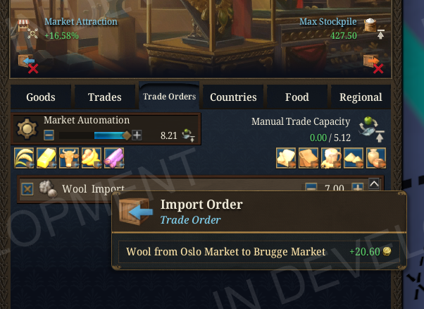 When you set an Import Order, you allocate some of your Merchant Capacity to automatically bring that good into your market, the AI finds the cheapest available source each day. An Export Order works the same way, directing the AI to push your surplus goods out to the most profitable destination it can find.