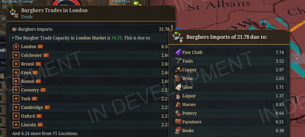 The market summary panel now shows a dedicated Burgher Trade Capacity figure with a full breakdown tooltip, so you can see exactly how many trades your burghers in that market are generating and what is contributing to that number. The tooltip correctly scopes to the player country when viewing a foreign market, giving you your own burghers' contribution rather than the market aggregate.