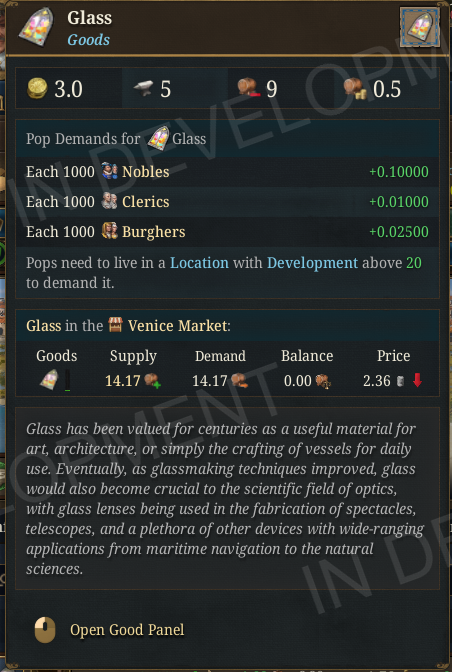 Glass now has a more meaningful role. Its base price rose from 2 to 3, and nobles, burghers, and clergy now actively demand it, making glassmaking a more viable industry rather than a niche luxury curiosity.