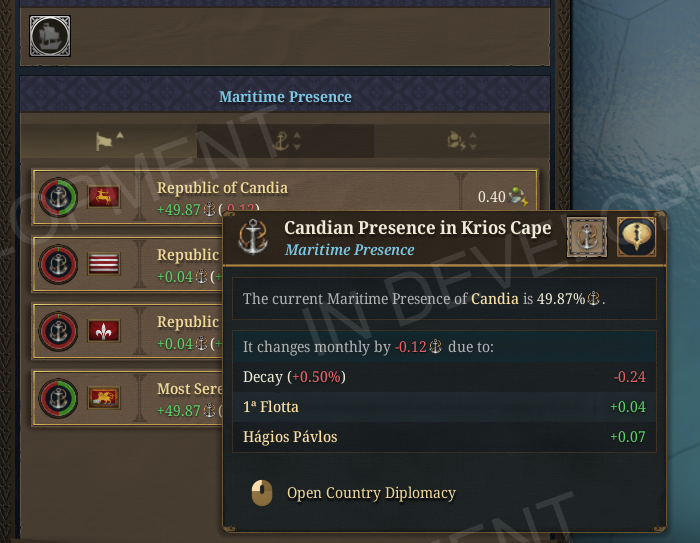 To complete the maritime loop, navies now contribute Maritime Presence upward to their overlord, so colonial powers and subject-holding empires benefit from the sea control their subjects maintain. This makes building a distributed naval empire feel rewarding in a way that the older system didn't support. We also halved the distance penalty for sea routes specifically, reflecting the historical reality that pre-modern bulk goods moved far more cheaply by ship than by land.