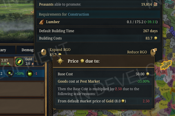 The expansion cost breakdown tooltip now shows exactly how much the good's market price is contributing to the cost, so you can see at a glance why one RGO is more expensive to scale than another.