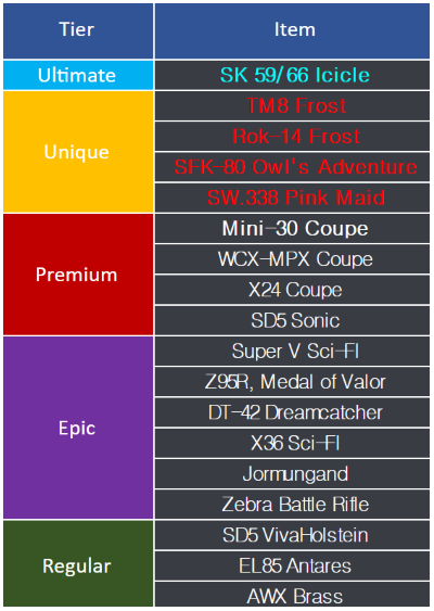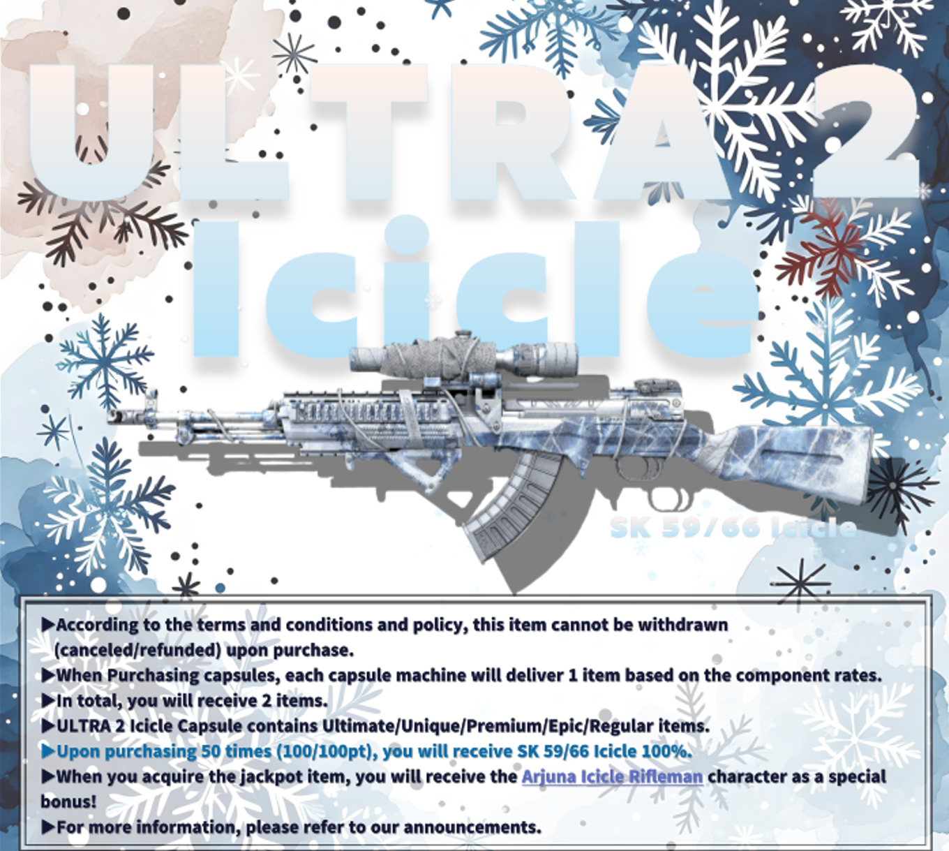 Mercenaries!ULTRA 2 Icicle Capsule are now available in the Special Shop!It's been released with attractive performance and a gun decal perfect for the winter season.We hope you'll show off your skills with this capsule, which offers exceptional character perk rewards.◈ ULTRA 2 Icicle Capsule※Upon purchasing 50 times (100/100pt), you will receive SK 59/66 Icicle 100%.\[Open Schedule]Time (UTC): 2026. 01. 27, 08:00 AM ~ 2026. 02. 05, 11:59 PM*Schedule may be subject to change.\[Item Spec]SK 59/66 Icicle is Ultimate grade Weapon.\[[b]SK 59/66 Icicle[/b]]A Painted model of the SK 59/66 Shadow Leaf with an ice-inspired design.It Fires sharp, icicle-like rounds that pierce straight into the enemy's heart.\[Purchase Bonus]Upon purchasing 50 times (100/100pt), you will receive SK 59/66 Icicle 100%.Meet the conditions below to receive bonus rewards.Purchase RequirementBonus RewardObtain SK 59/66 Icicle※ The reward will be sent within 3 days after the sales end.\[Arjuna Icicle]This character is a rifleman.\[TM8 Frost]\[Rok-14 Frost] \[Capsule Components]Sincerely,Your AVA Operations Team