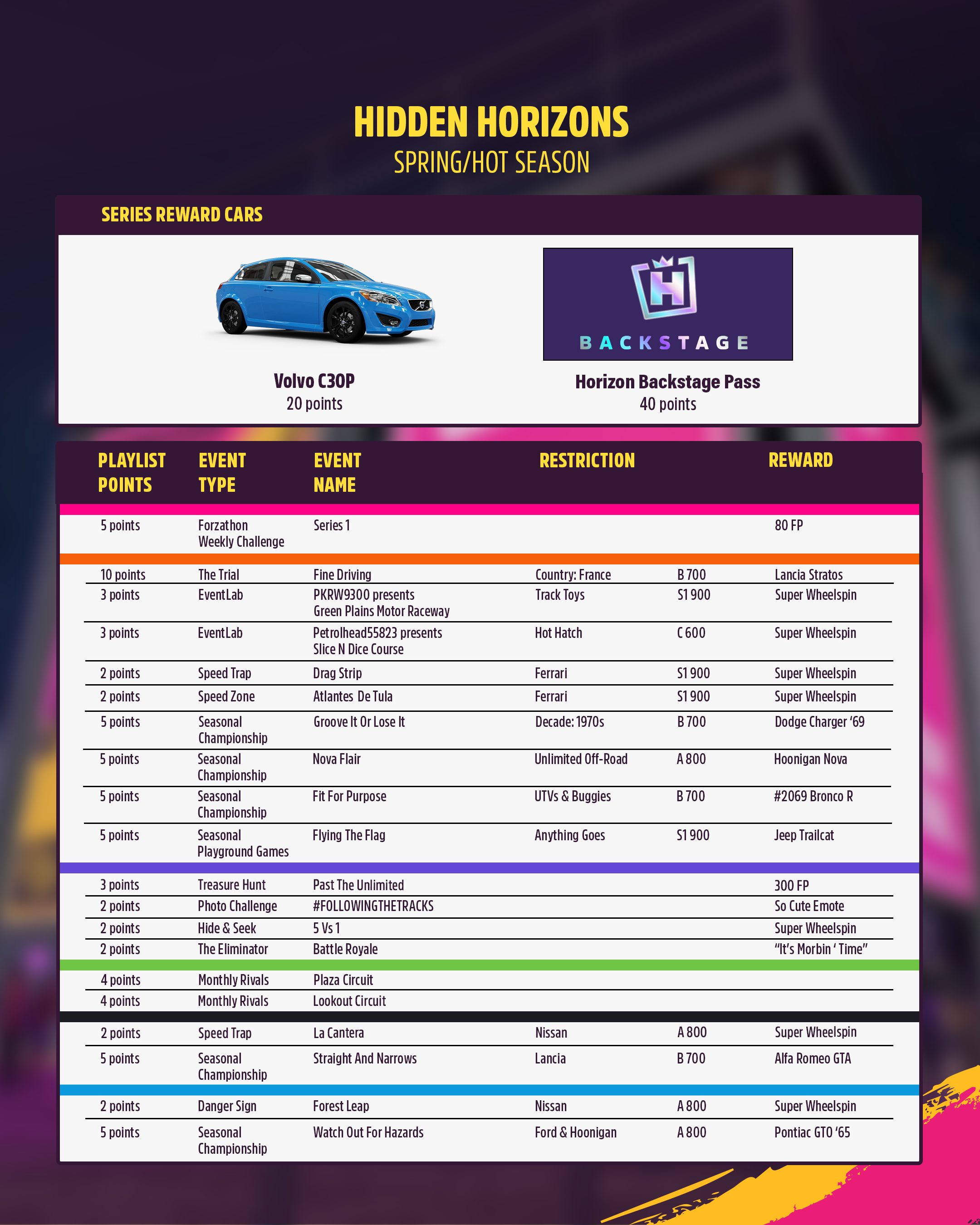 The final chapter of the mystery novel we call Festival Playlist is here. Complete its challenges to earn 20 PTS and get your hands behind the wheel of a limited production car: the 2013 Volvo C30 Polestar. Like Sherlock and Watson, Volvo partnered with Polestar to create a 405 horsepowered ready-to-race hatchback. With an aerodynamic design inspired by the C30 Volvo signed up for the Swedish Touring Car Championship and a 2.5-liter turbo engine, the C30 can run from 0-100 kph in just about 6 seconds. Find missing Captains, search for lost jewels, chase after supernatural dogs, or simply run around the track on this week’s 20 PTS reward! Unlock it from January 22 until January 29. Finish the month of mysteries with a final adventure in the Horizon Festival: SERIES REWARDS 80 PTS: 2010 Nissan Tsuru 160 PTS: 1985 Nissan Safari Turbo SPRING REWARDS 20 PTS: 2013 Volvo C30 Polestar 40 PTS: Backstage Pass Join a thrilling game of chase with Hide & Seek! Play as the Hider and conceal your presence to reach the End Zone undetected or join as part of the Seekers to take home the win by staying close to the Hider and filling your meter before time runs out. This 5v1 game mode includes crossplay functionality. You can also join solo or with a group of friends as a convoy.