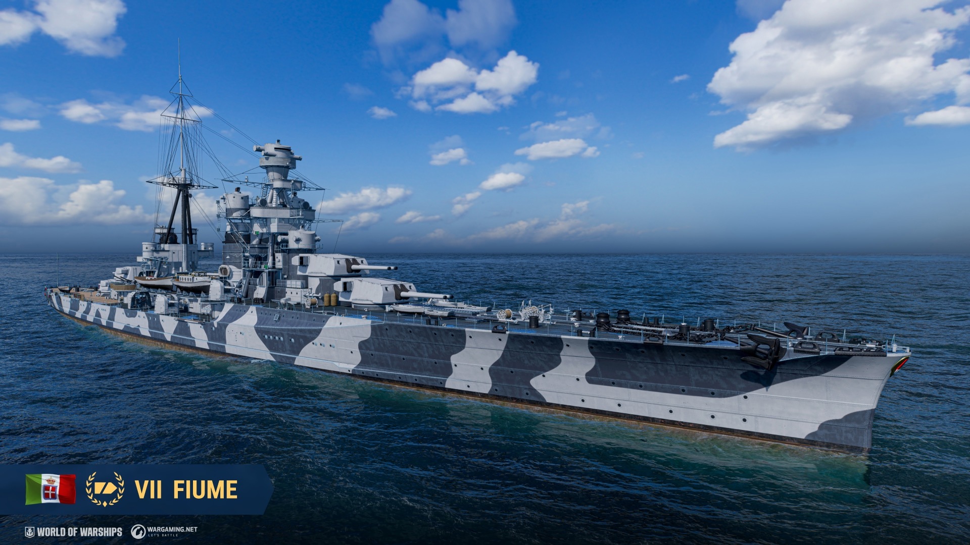 - Second progression line (3,000 Doubloons): Blue Explosion destruction effect, 2x Regia Marina permanent camouflages, Tier VII Premium cruiser Fiume, Commander Domenico Folgore (10 skill points), and Legion camouflage for Vittorio Veneto as the final reward.