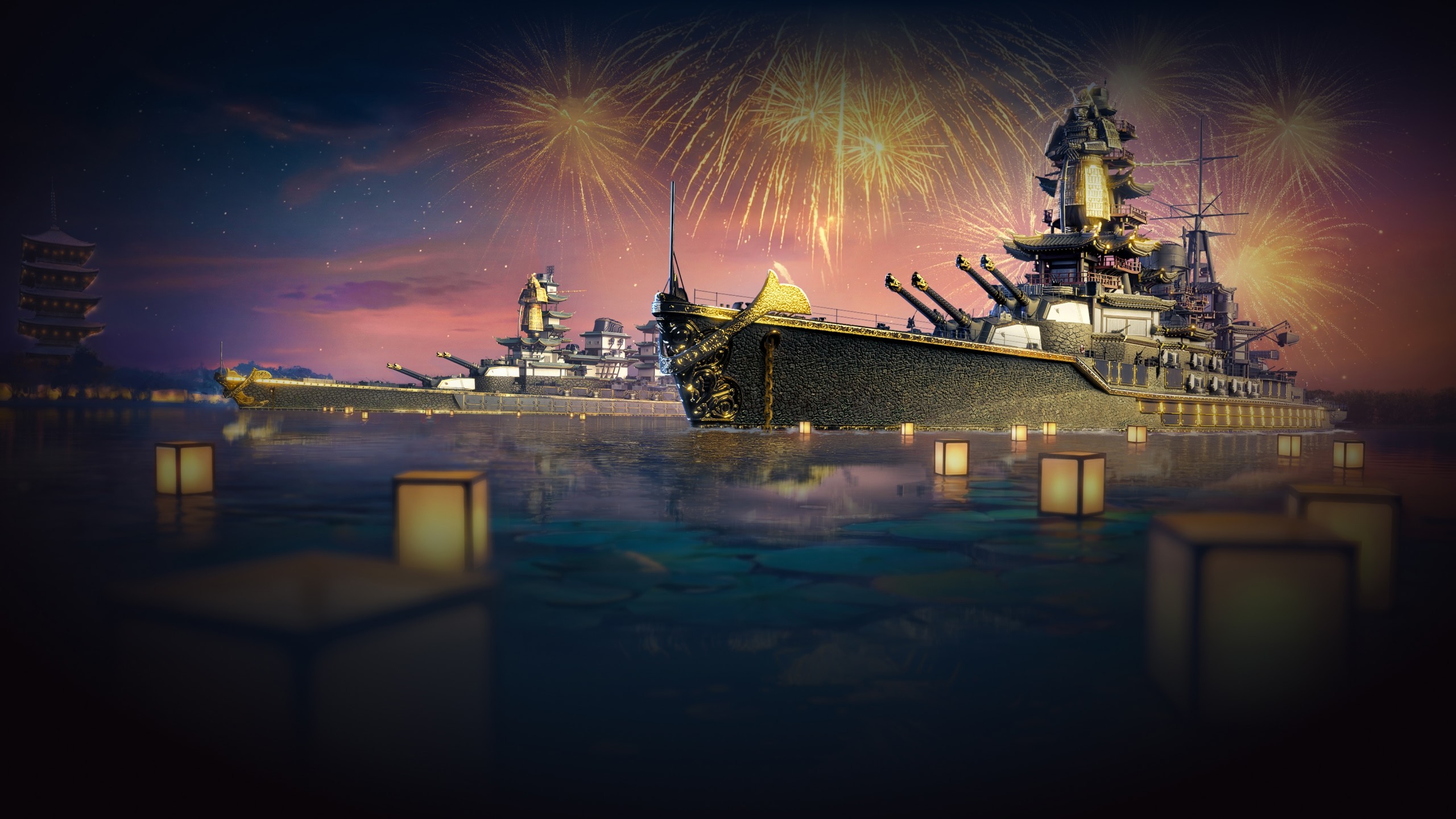 - Second progression line: Japanese Castle permanent camouflage for Amagi, 2x Golden Week permanent camouflages, Japanese Tier VI Premium battleship Ise, and the Goldfall enemy destruction effect (final reward).