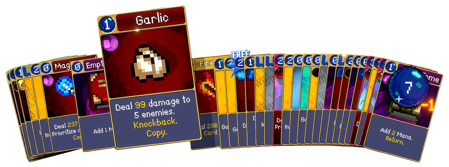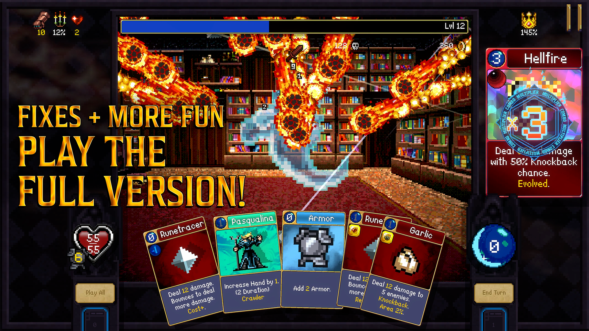 Deckbuilding through progression: level up to gain new cards, find power-ups, chase evolutions, and customize your runs