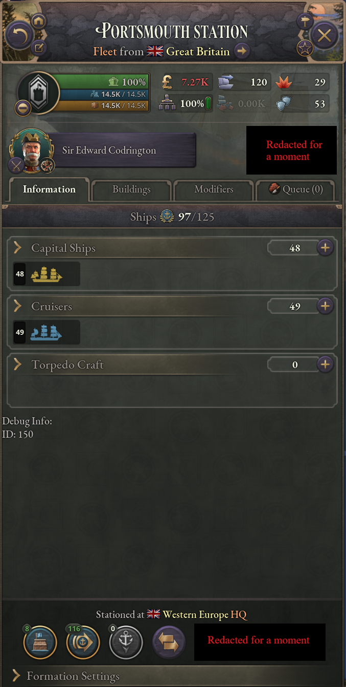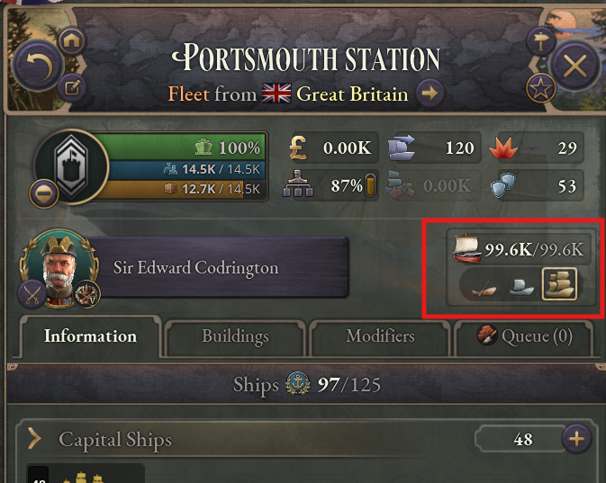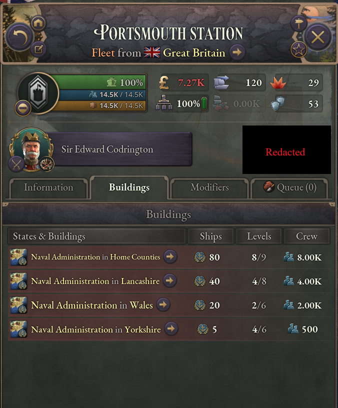 So, all in all, Naval Administrations act much more like a pool of sailors which your Navy draws from. Despite that, with the “slot” logic, we are still able to track directly which buildings should be affected by losses suffered in combat. So if the HMS Claudius, whose Naval Administration buildings are in Home Counties, should suffer crew losses, we would be able to see soldiers there being killed and having to be replenished.