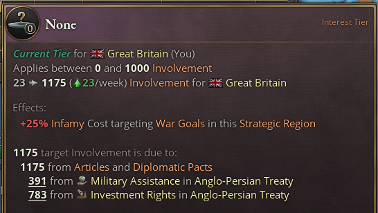 By signing a treaty with Persia wherein the Shah grants us Investment Rights, and in return we send them some of our officers as military attachés, we will be generating enough involvement to push us to a level 1 interest.