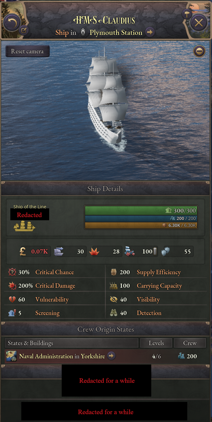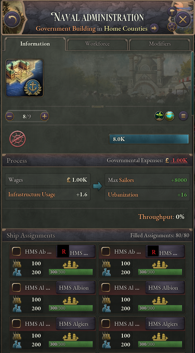 With Naval Administrations come some key changes, though. The most impactful one is that there is no longer a 1:1 connection between a ship and the building. Naval administrations will hire a total of 1000 sailors per level, but they can be distributed in chunks of 100 people. A small frigate may only need 100 people, and will take a “slot” of one level, leaving 900 men to be spread across other ships. Large ships such as our HMS Claudius may even need 1500 men, meaning they occupy more than one full level.