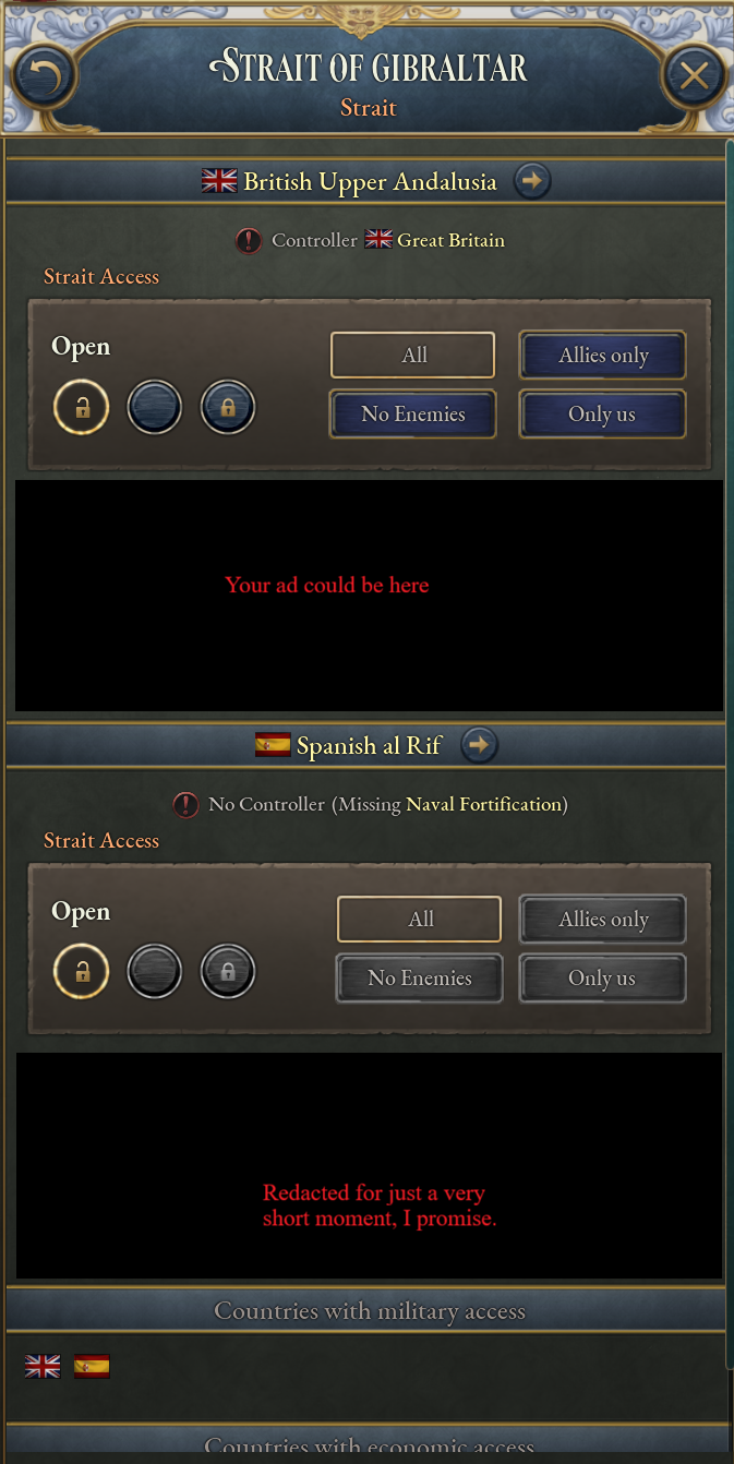 I should also mention that we have implemented one special case, Gibraltar, which requires you to own both sides of the strait before you can lock it down. This was simply too impactful when you could lock down all of the Mediterranean from the get-go.