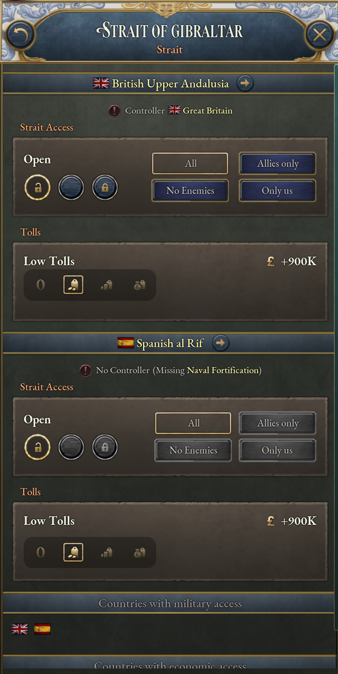 Important to note here is that all access levels behave like an AND gate, meaning that if your buddy Denmark would gladly let you through, but the Swedes didn’t like your comments about their candy and closed the strait for you, you will NOT have access to the other side with your fleet. One side can block the other.