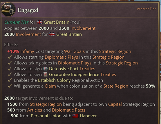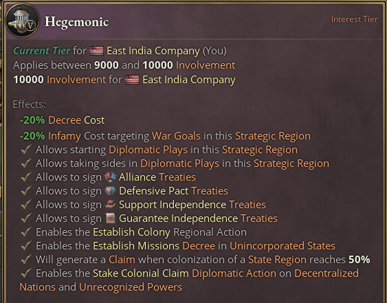 Attaining ever higher levels of interests will be important because it will allow you access to diplomatic actions and treaty articles to sign with Local Countries that may otherwise not be available, as well as wholly new and never before seen benefits—like, for example, the ability to generate “Colonial Claims”. That is, being granted a claim on a state region, once your colony there grows to at least half the state region’s size.