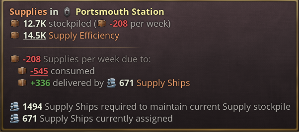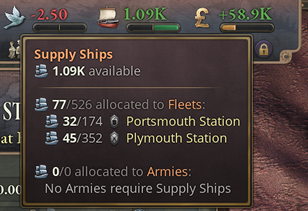 For example, the main battle fleet with the HMS Claudius consumes 2000 Supply per week. They are active, far away from home and sailing around Gibraltar. In order to keep their current Supply status of 100%, they need 250 Supply ships, which is what is being assigned to them by default.