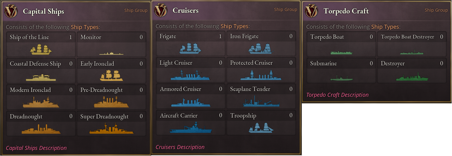 In this information tab you will see an overview of your fleet, sorted into three unfoldable categories of ships: Capital Ships, Cruisers and Torpedo Craft. I guess this is a good moment to talk about ship types in general!